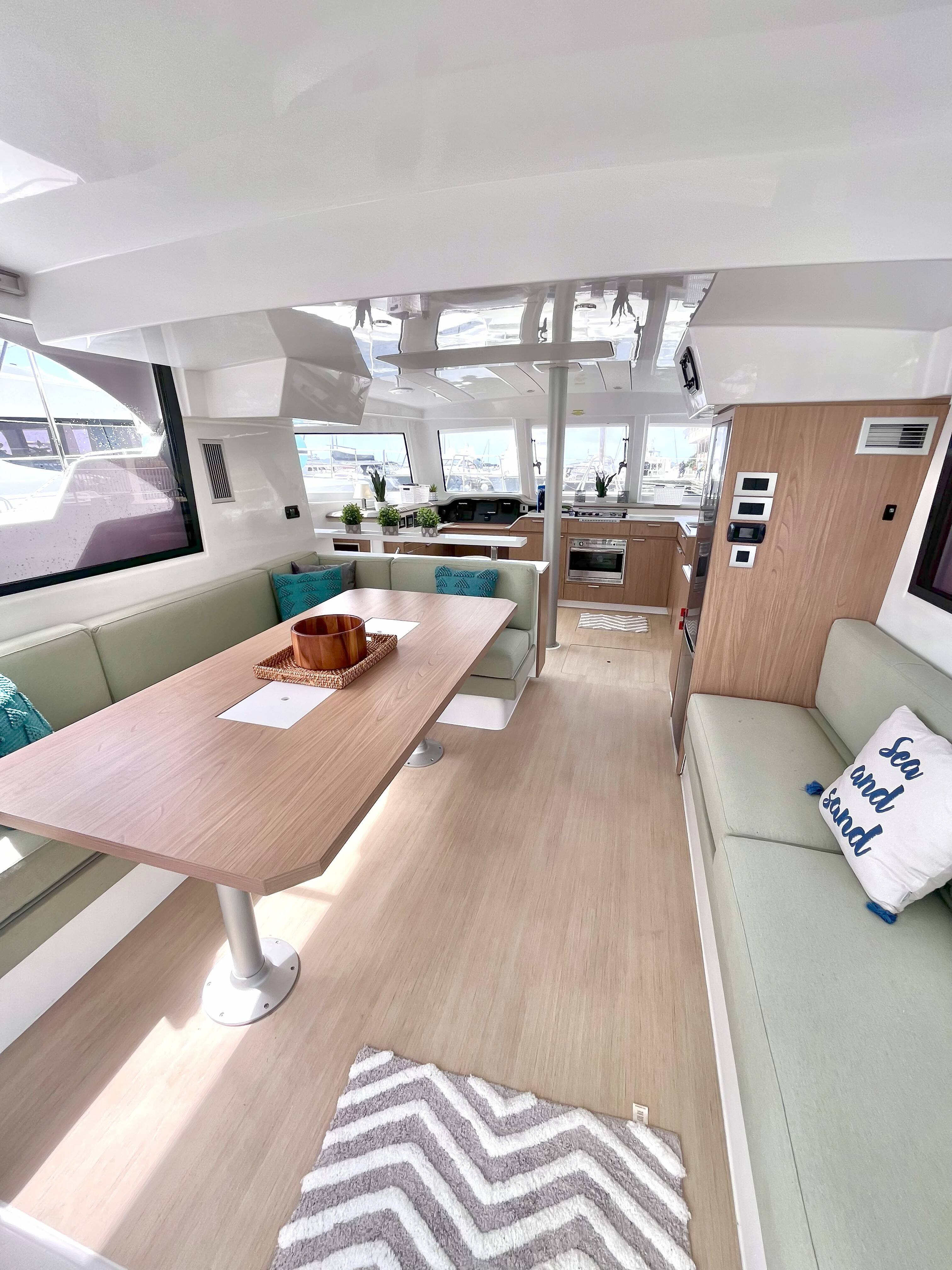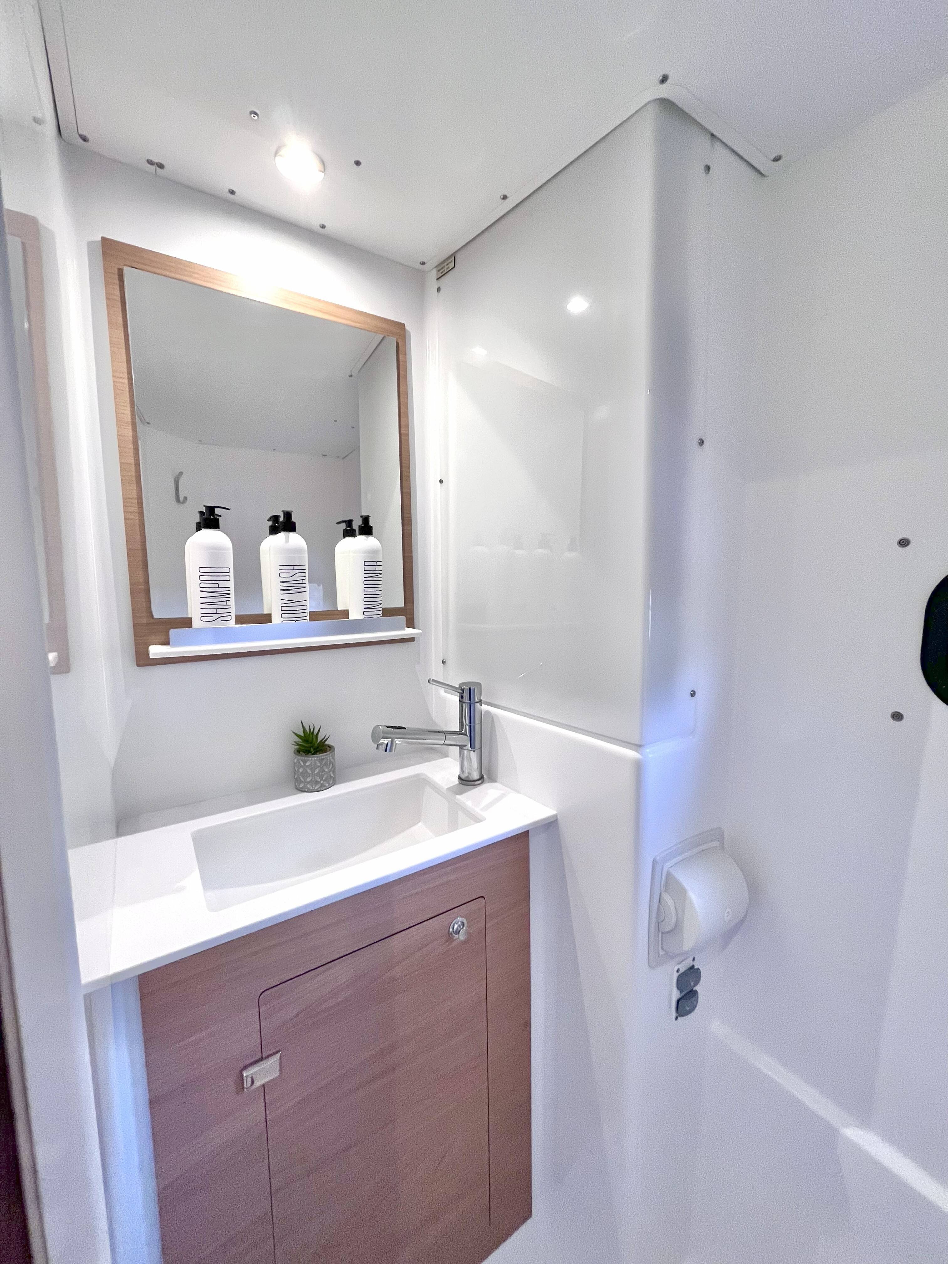 Catamaran Bali Catspace OW Yamas, built in 2024 is anchored in the BVI, Hodge's Creek Marina, British Virgin Islands, British Virgin Islands. It has 3 cabins, can accommodate 6 people and has 3 toilets.