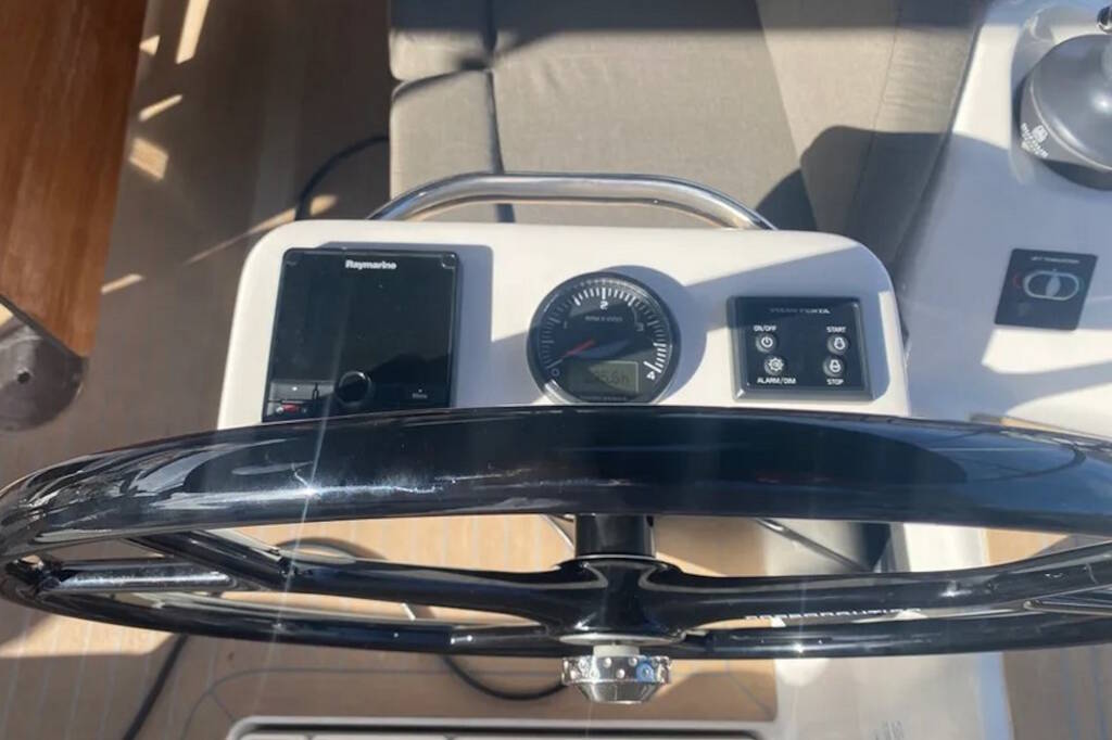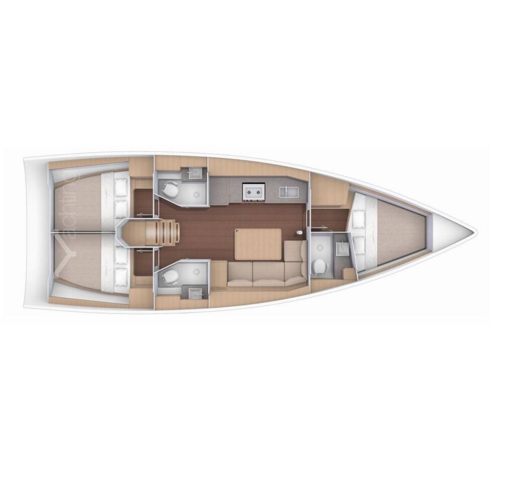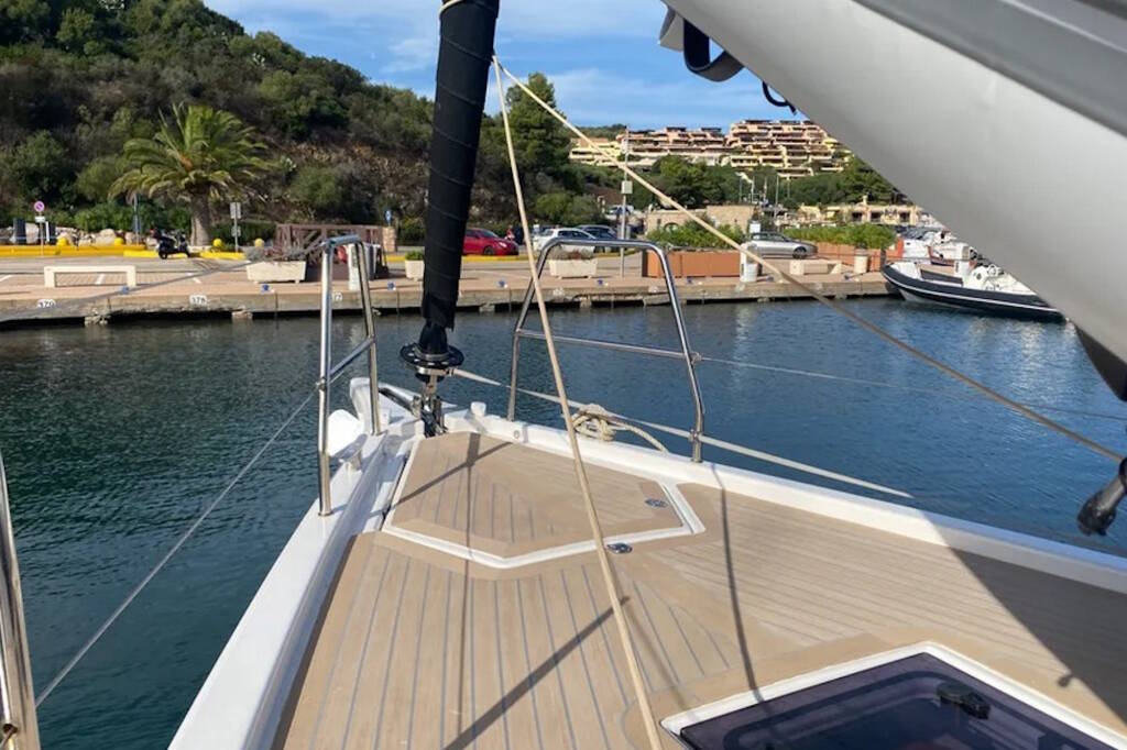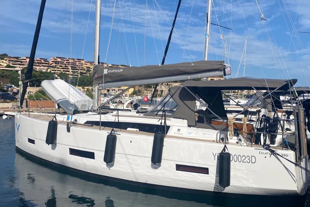 Sailing yacht Dufour 390 Yaya, built in 2023 is anchored in the Marina di Portisco, Sardinia, Italy. It has 3 cabins, can accommodate 6 people and has 3 toilets.