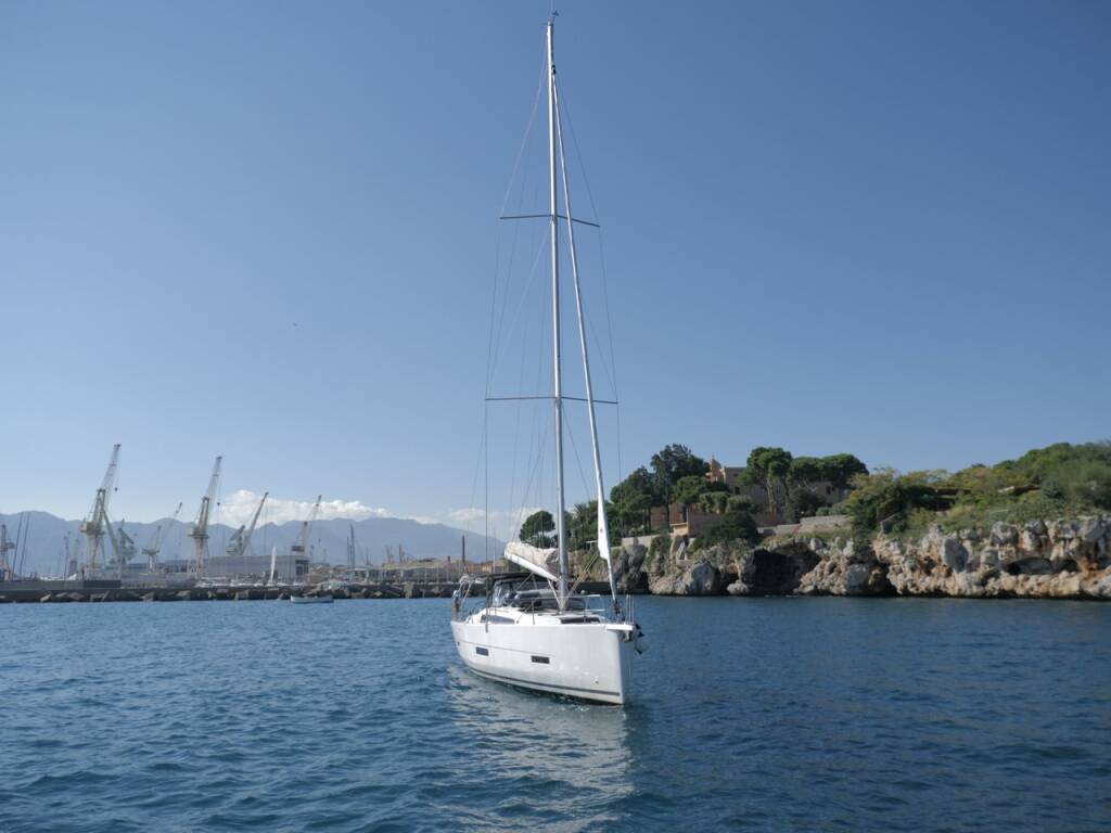 Sailing yacht Dufour 430 Bloody Mary, built in 2021 is anchored in the Marina Poseidon, Milazzo, Sicily, Italy. It has 3 cabins, can accommodate 6 + 2 people and has 3 toilets.