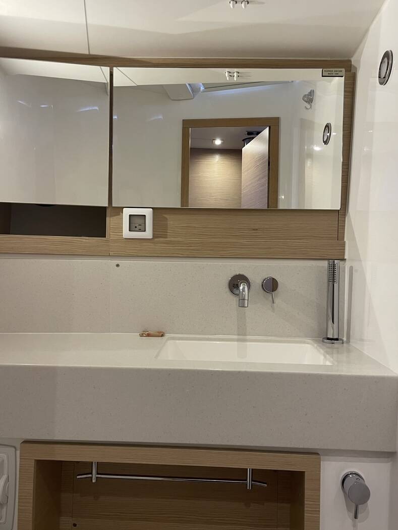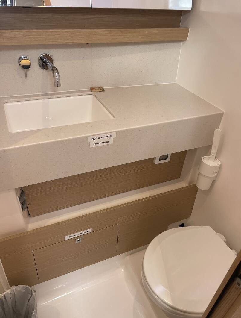 Knot Online has the space to comfortably take 6 people on your adventure with 2 queen sized aft cabins and a luxurious master cabin that has its own private toilet and shower. The windows in the cabins and salon allow plenty of light making the space bright and the feeling is only accentuated by the modern, light colored wooden interior. The galley is equipped with all the home essentials like a coffee maker, oven, 4 burner stove, and plenty of counter space to make delicious meals on the water. Outside is an electric swim platform that can double as an outdoor kitchen with a grill/griddle. She is also equipped with numerous amenities, such as a water maker, generator, and air conditioning for your utmost convenience.