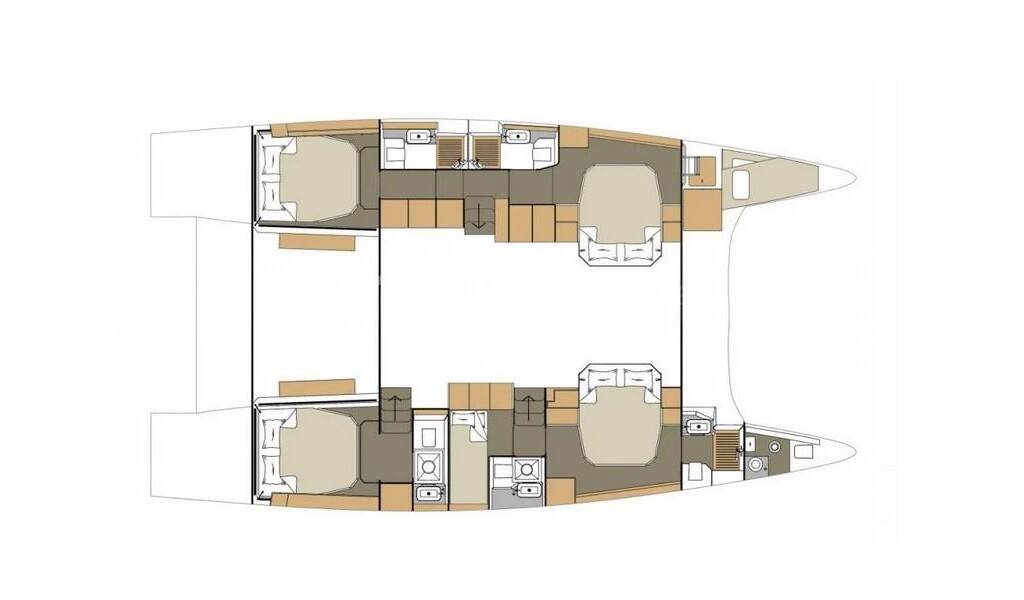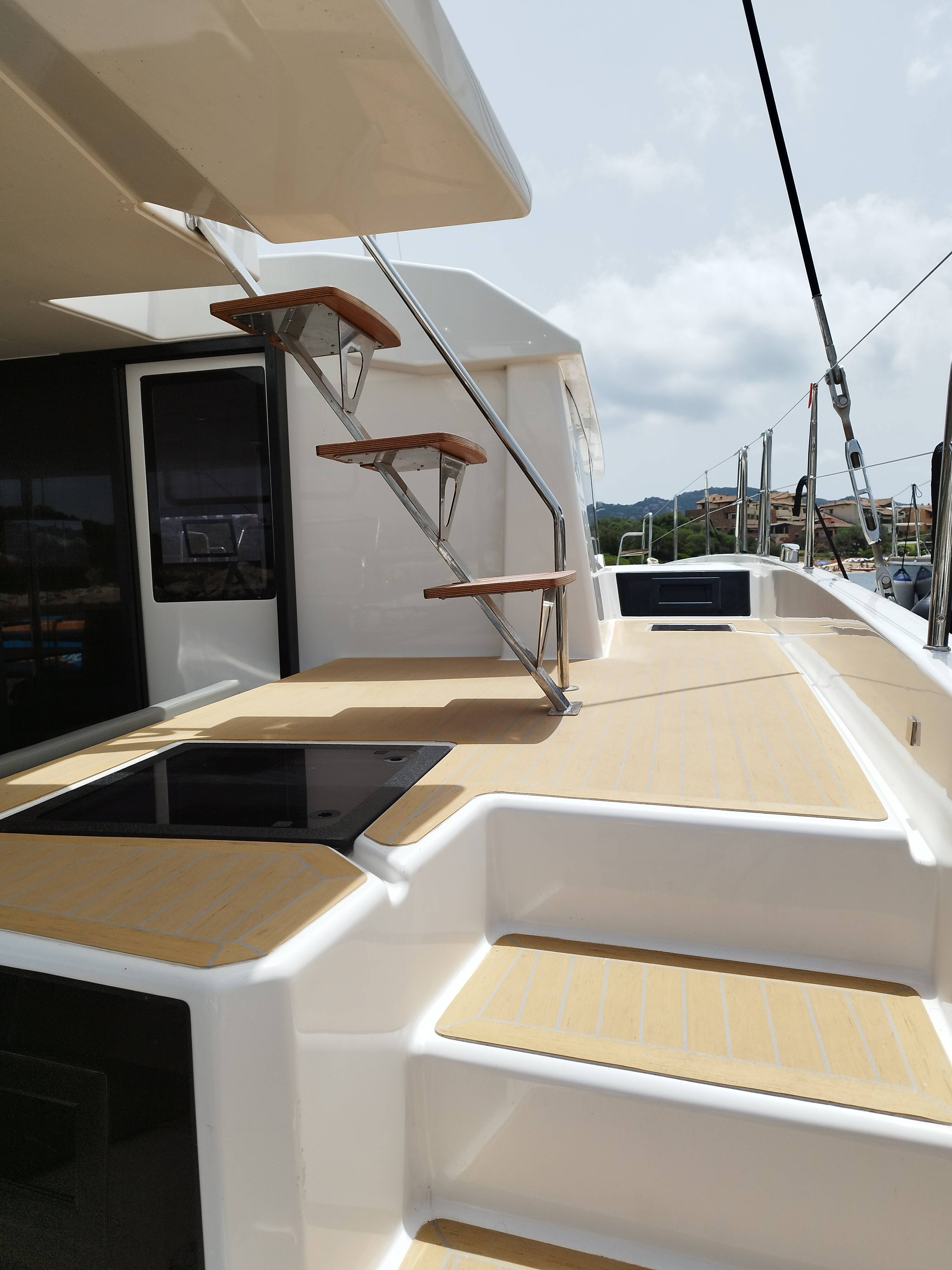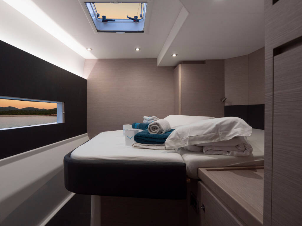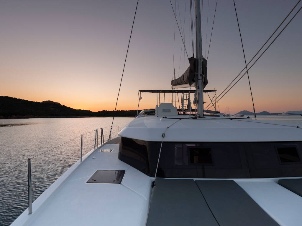 Catamaran Dufour 48 Catamaran Delphinus, built in 2023 is anchored in the Sardinia, Punta Nuraghe, Sardinia, Italy. It has 5 + 1 cabins, can accommodate 10 + 2 people and has 5 + 1 toilets.