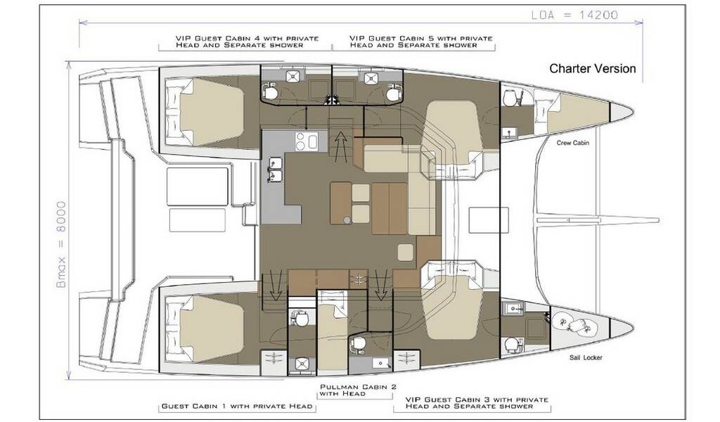 Catamaran Dufour 48 Catamaran Freya, built in 2025 is anchored in the Marina Pirovac, Šibenik region, Croatia. It has 5 + 1 cabins, can accommodate 10 + 1 + 1 people and has 5 + 1 toilets.