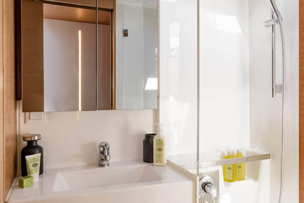 +provisioning ; Crew on board must have their own toilets/ showers. If either a skipper or a hostess/cook is on board, 1 double cabin will be required for him/her. If both a skipper and a hostess/cook are on board, 1 double cabin and 1 forepeak cabin will be required for them. Exceptions exists for specific layouts, Sales Agents will provide more details about the different boat models. - Payable at the base