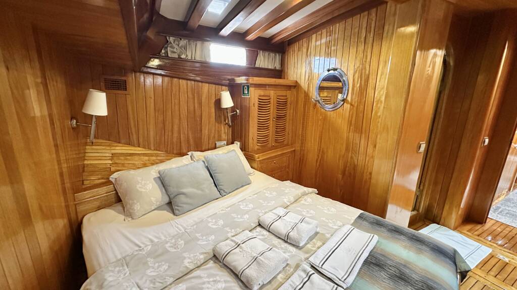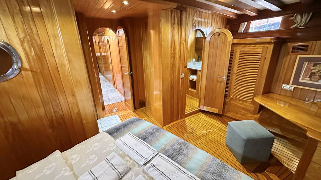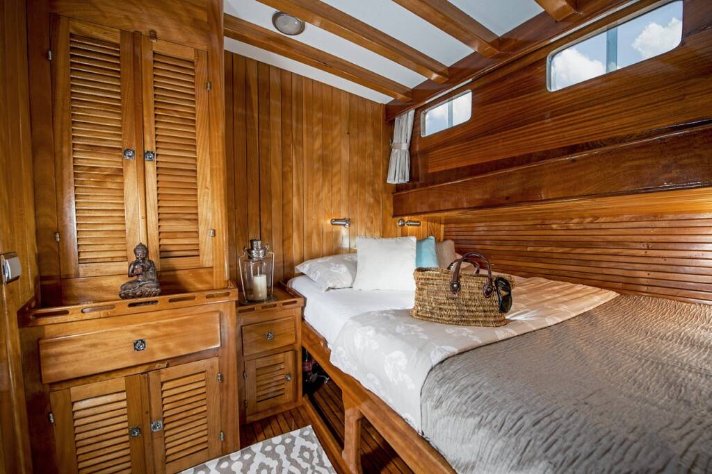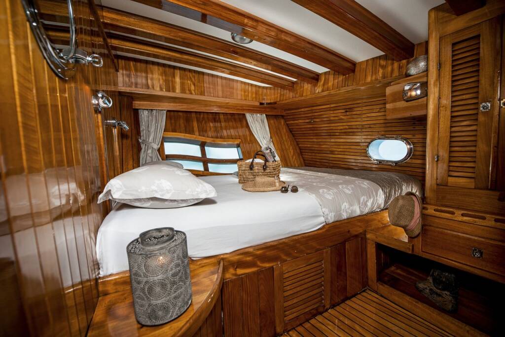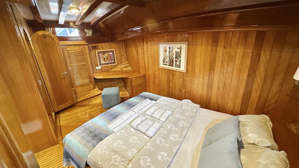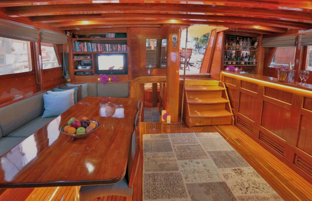 The yacht hosts 7 luxurious air-conditioned cabins comprising 1 master, 4 doubles, and 2 twins and can accommodate up to 14 guests. Each cabin comes with a private bathroom, hair dryer, and large storage spaces. A tastefully decorated indoor salon along with a comfortable corner seating group, inside dining, and an open bar provides a perfect venue to escape from the sun and outdoors to relax.