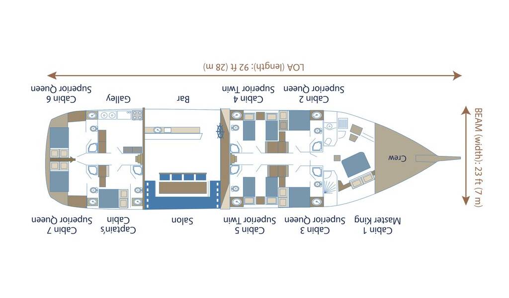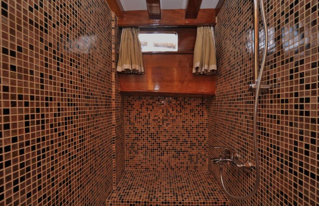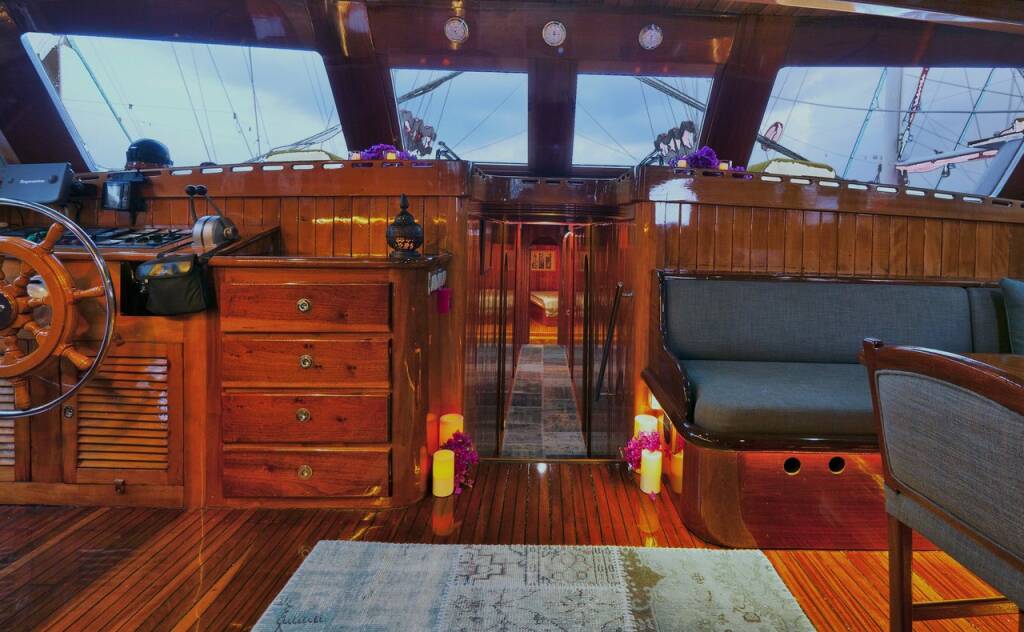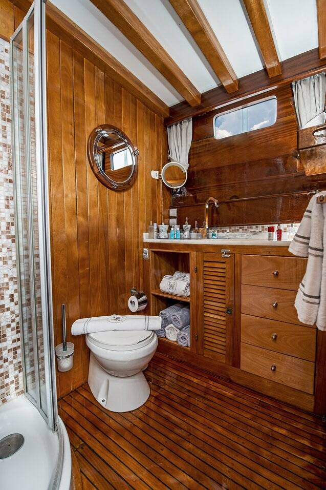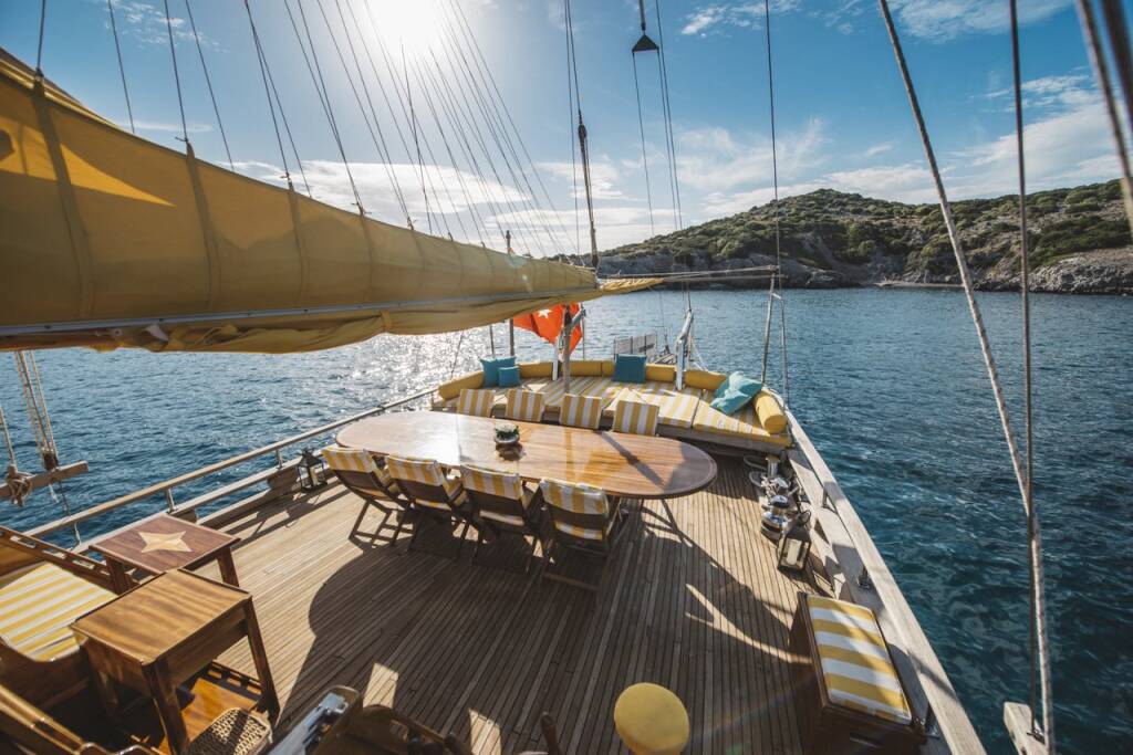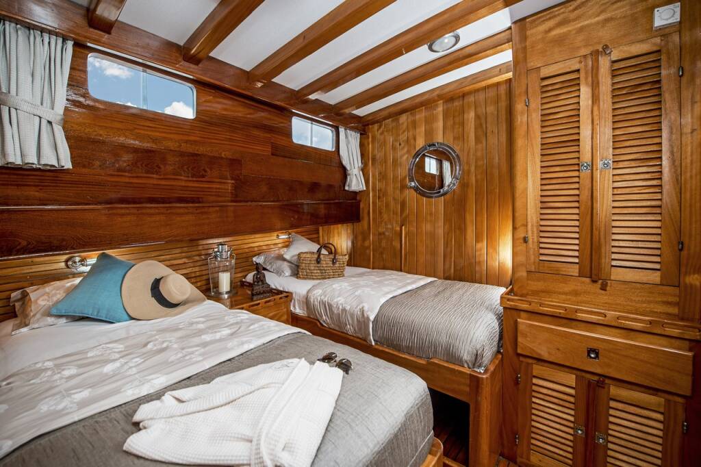 The yacht hosts 7 luxurious air-conditioned cabins comprising 1 master, 4 doubles, and 2 twins and can accommodate up to 14 guests. Each cabin comes with a private bathroom, hair dryer, and large storage spaces. A tastefully decorated indoor salon along with a comfortable corner seating group, inside dining, and an open bar provides a perfect venue to escape from the sun and outdoors to relax.