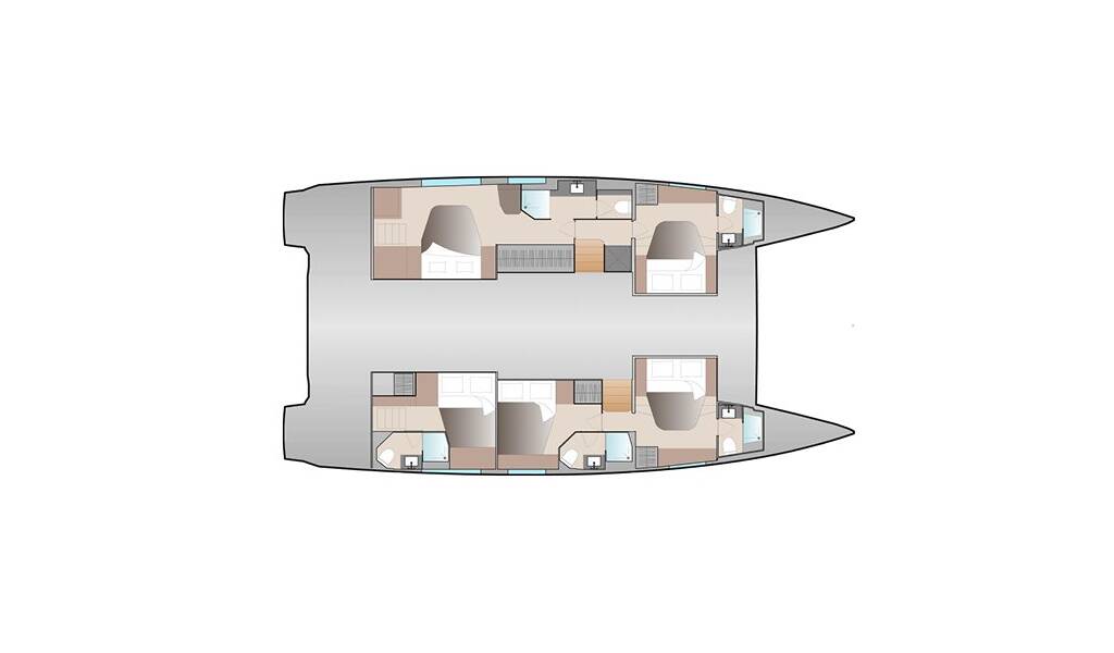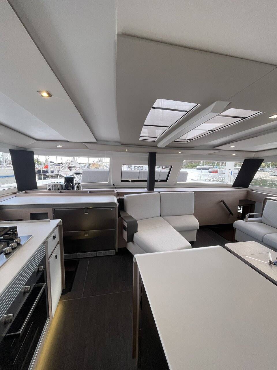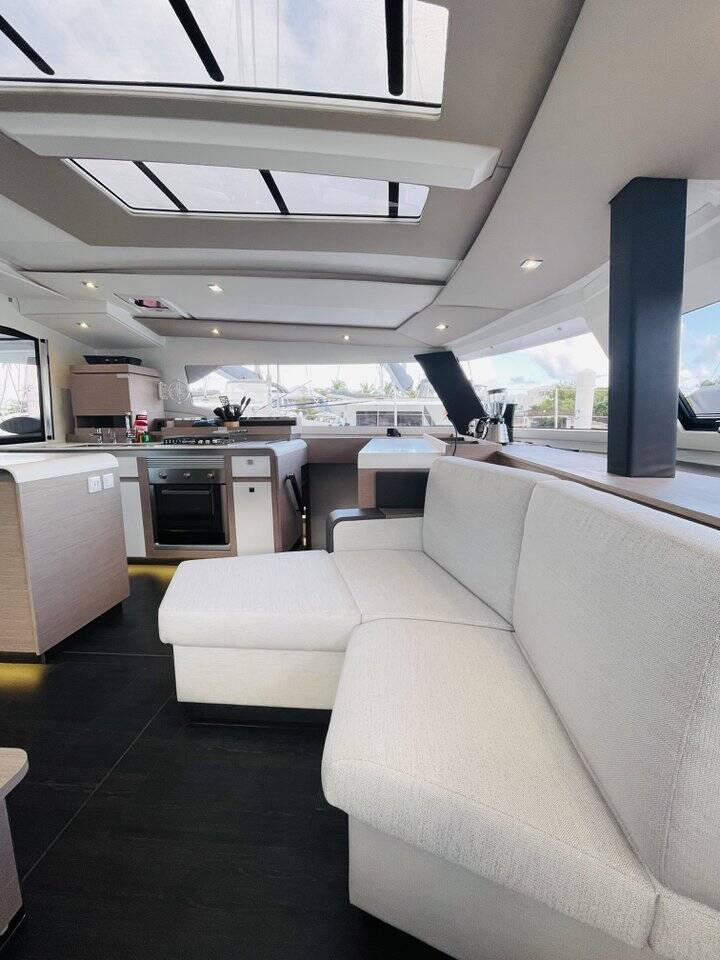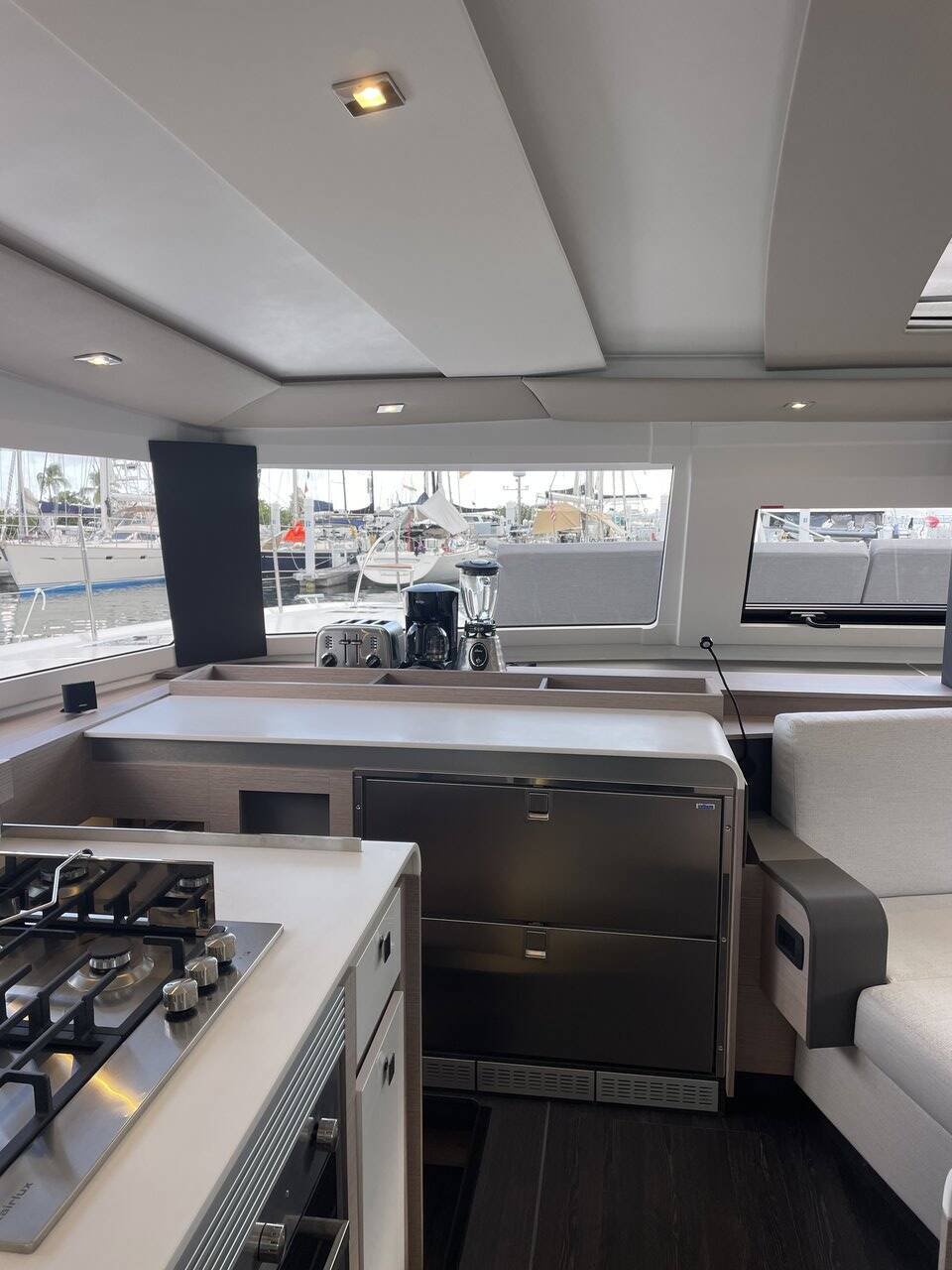 Well....Hoylah to this! A stunning, brand-new Aura 51 from Fountaine Pajot with 5 cabins, each with their own head, allowing 10 people to comfortably join the adventure. All cabins have a queen bed and a beautiful view of the ocean. Her updated cockpit and saloon design have created a larger, more spacious lounging and dining area. The large sliding glass door opens the entire salon allowing for communication between the galley and cockpit table, which provides an even greater feeling of freedom and space.