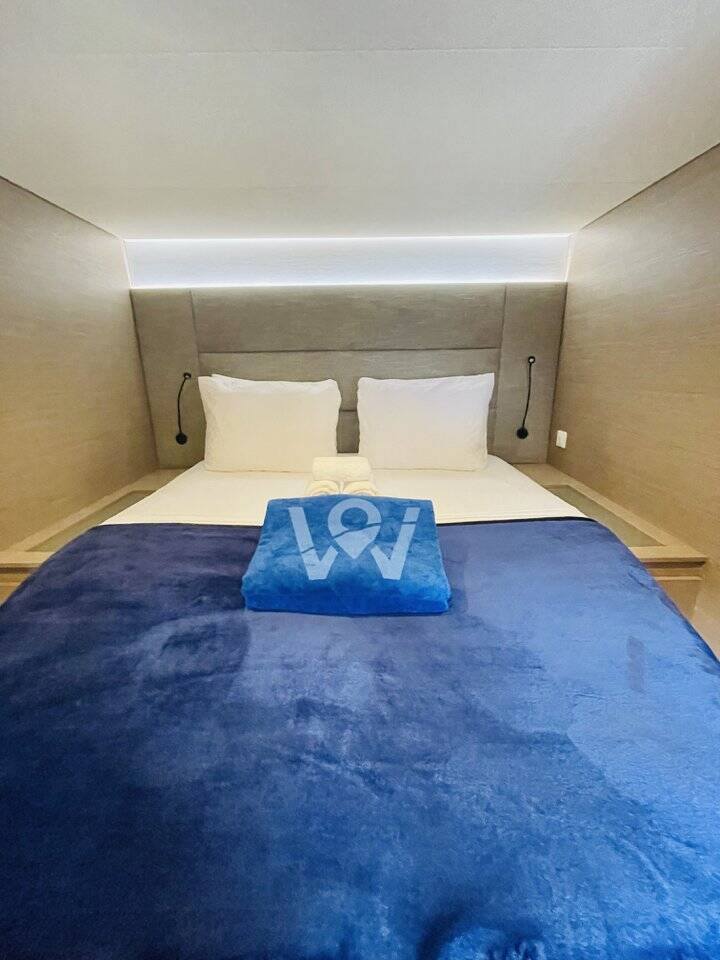The large flybridge, outfitted with a lounge and suntanning area, is a must-see and a great place to watch the sunset. Right next to the lounge is the elevated helm station decked out with a chart plotter, autopilot and electric winches to make sailing a breeze. Like all of our luxury yachts, she is fully equipped with various amenities, including a water maker, generator, and air conditioning for your utmost convenience.