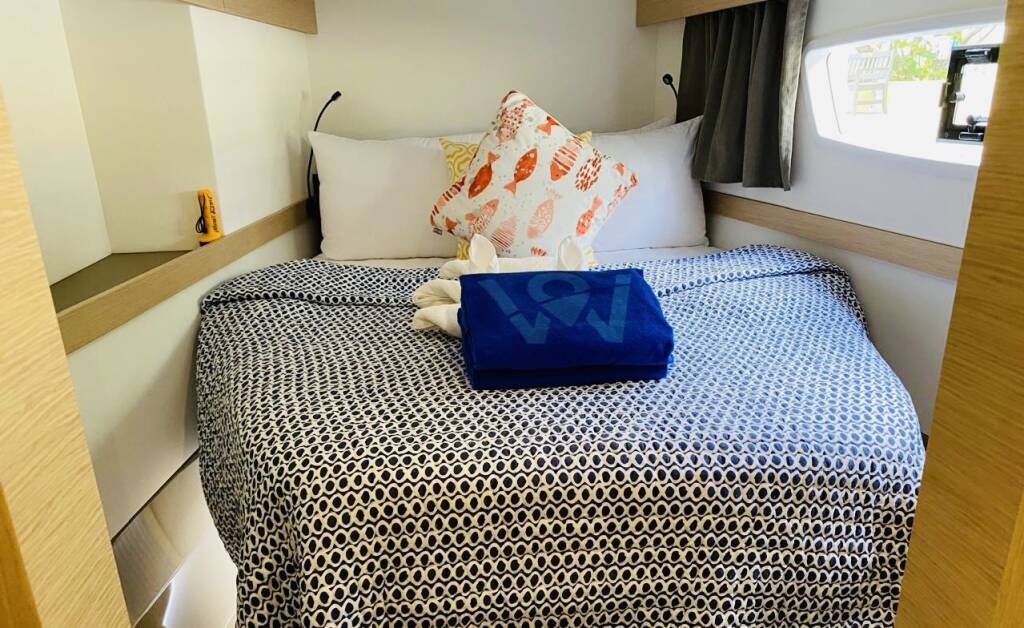 This three cabin, three head boat is perfect for couples and families. It offers the privacy of your own space while having plenty of shared area to lounge and chill out. The showers and toilet are separate in each head. The beds area all queen size and have reading nightlights on each side of the bed. Equipped with a built-in ice maker, the galley has all the creature comforts of home while out being on the water. It has 2 large fridge drawers, a separate freezer, microwave, and large oven. She has a water maker, generator, and AC. The salon is light and airy with wrap around windows and two overhead skylights.