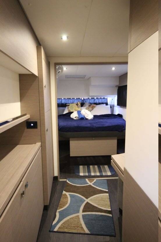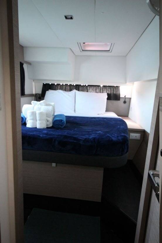 Spend some time relaxing in the sun on the spacious trampoline, or take the time to unwind in the large sun-sheltered cockpit while leaving your worries behind. The elevated, covered helm area gives the captain unobstructed views of the bow and starboard stern of the boat. Under the boom is a wonderful lounge area where guests can hang out and keep the captain company while sailing. This is also a great spot for star gazing!