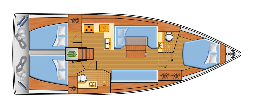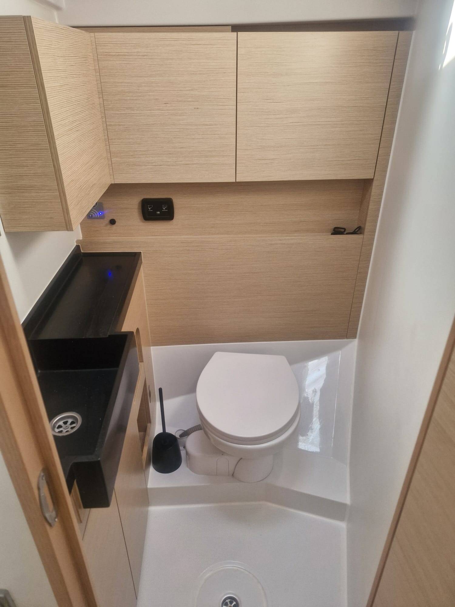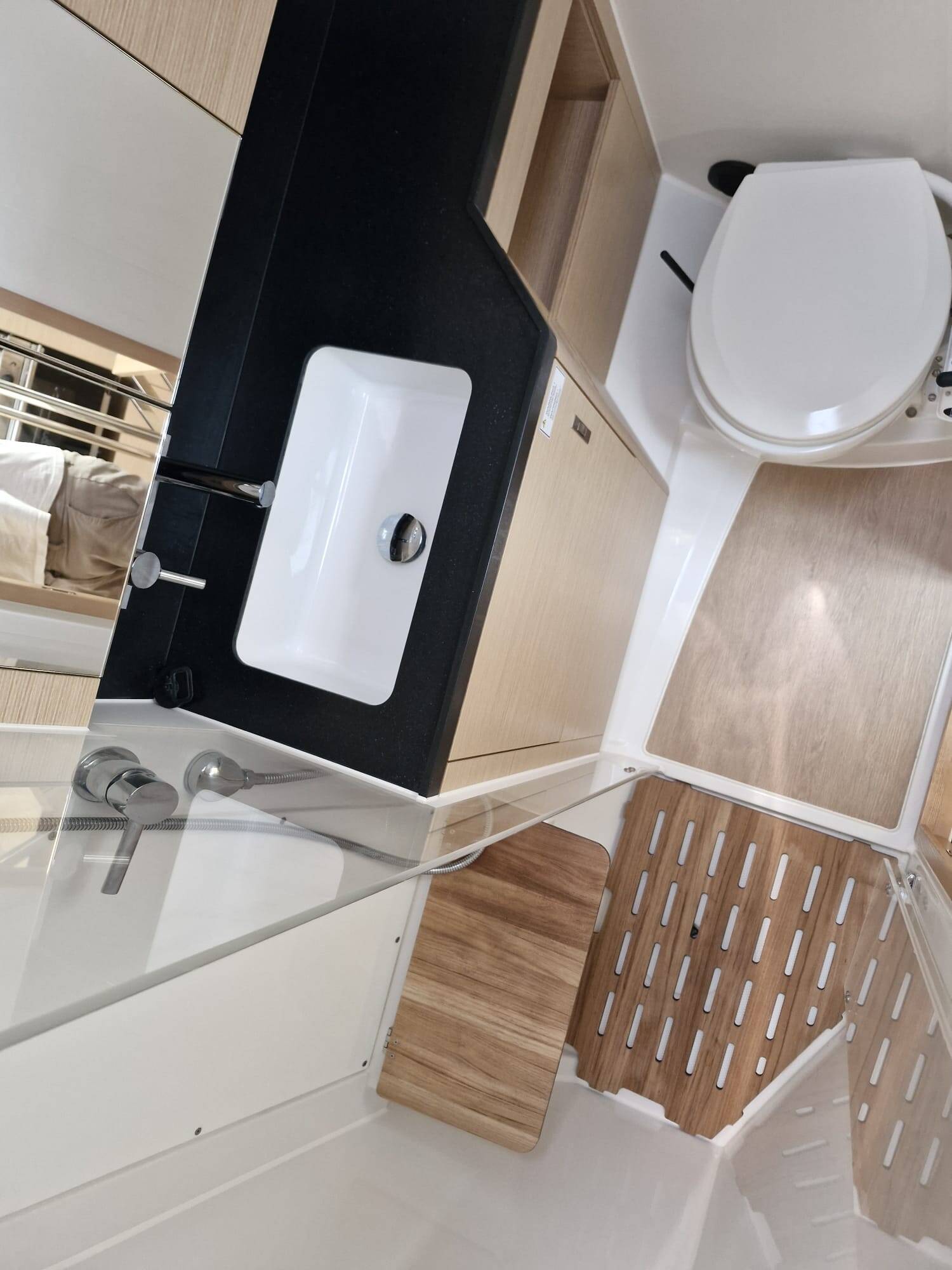 More powerful engine - Saildrive, 3-blade folding propeller, Synthetic teak on the cockpit floor - on the helmsman's seats - on the bathing platform and on the cockpit benches, 2 helmsman's seats foldable, footrests for helmsman, center cleats, electric anchor winch 1000 W with remote control, Delta anchor 16 kg with 30 m galvanized chain, cockpit windows in the aft cabins, shower in the cockpit arm/cold water, 2 GRP steering wheels, ELVSTRØM SPS Performance sails - fully battened triradial mainsail and headsail, Dyneema halyards for mainsail and headsail, mainsail slider system, 2 LEWMAR 45 ST EVO enua winches, floor lighting in the cockpit and on the companionway, fan for the superstructure hatch, indirect lighting in the saloon and cabins, LED ceiling lighting in the saloon and owner's cabin dimmable, SLS - Scenario Light System - touch screen controller and dimmer in the Salon, roller blind set with fly screens for deck hatches, roller blinds for hull windows, folding blinds for side cabin roof windows, wireless charger in the salon, USION MS-RA70N multimedia radio with Bluetooth - for salon and cockpit, 2x 2 speakers in the salon and cockpit, FUSION MS-NRX remote control in the cockpit, double berth in the salon, furniture - French Oak, floor Delight Oak, upholstery - Sorrento, side access for railing, 2 LEWMAR 45 EST EVO electric halyard winches, genoa tracks for 105% jib including cart with pin stop, lazy bag with lazy jacks, heating in all cabins - in the salon and in the bathrooms, refrigerator 12V 135L, mattresses for all cabins, bowsprit