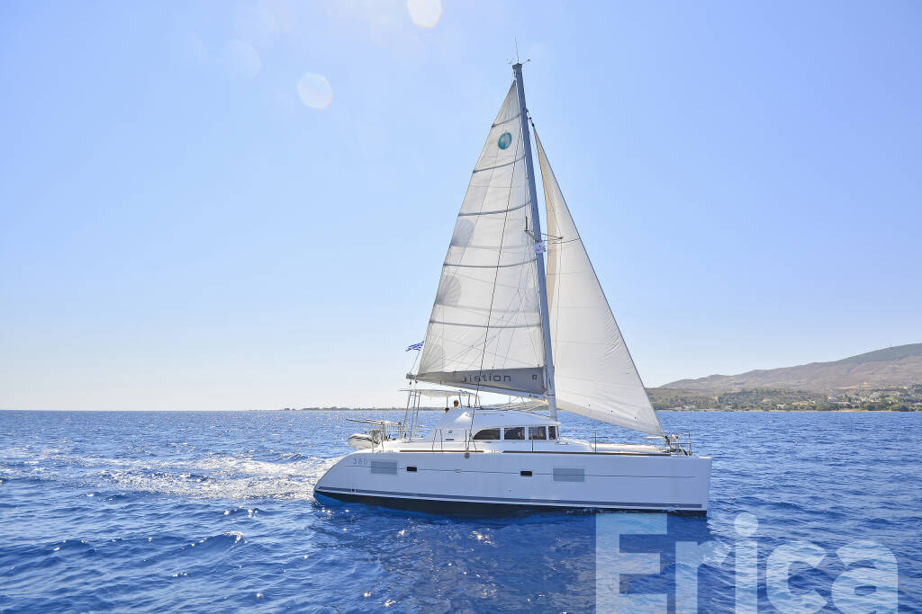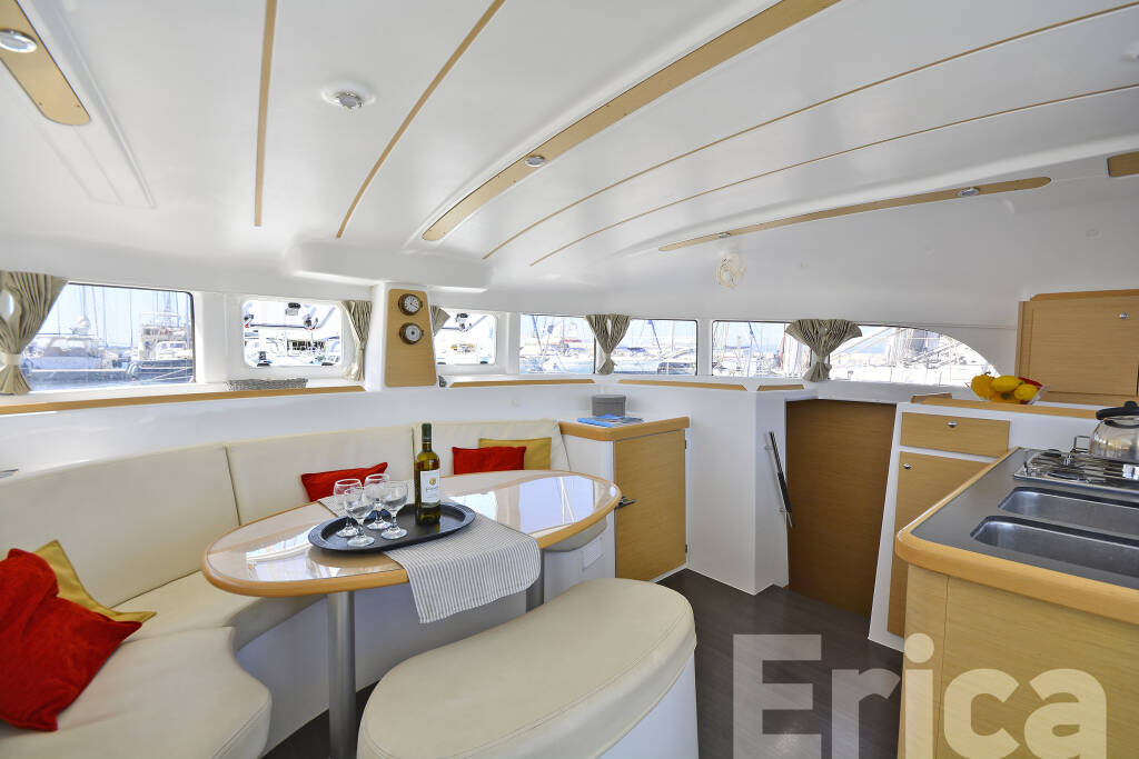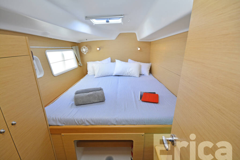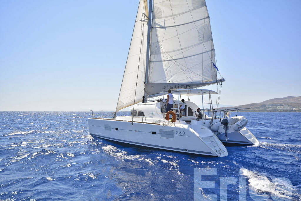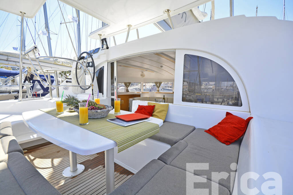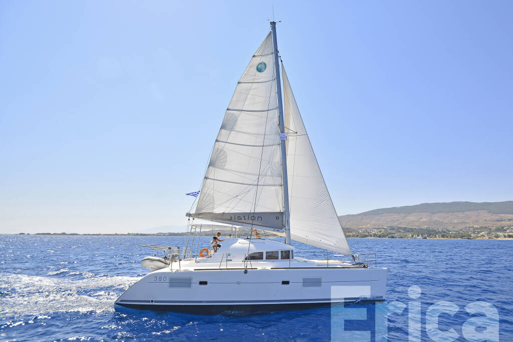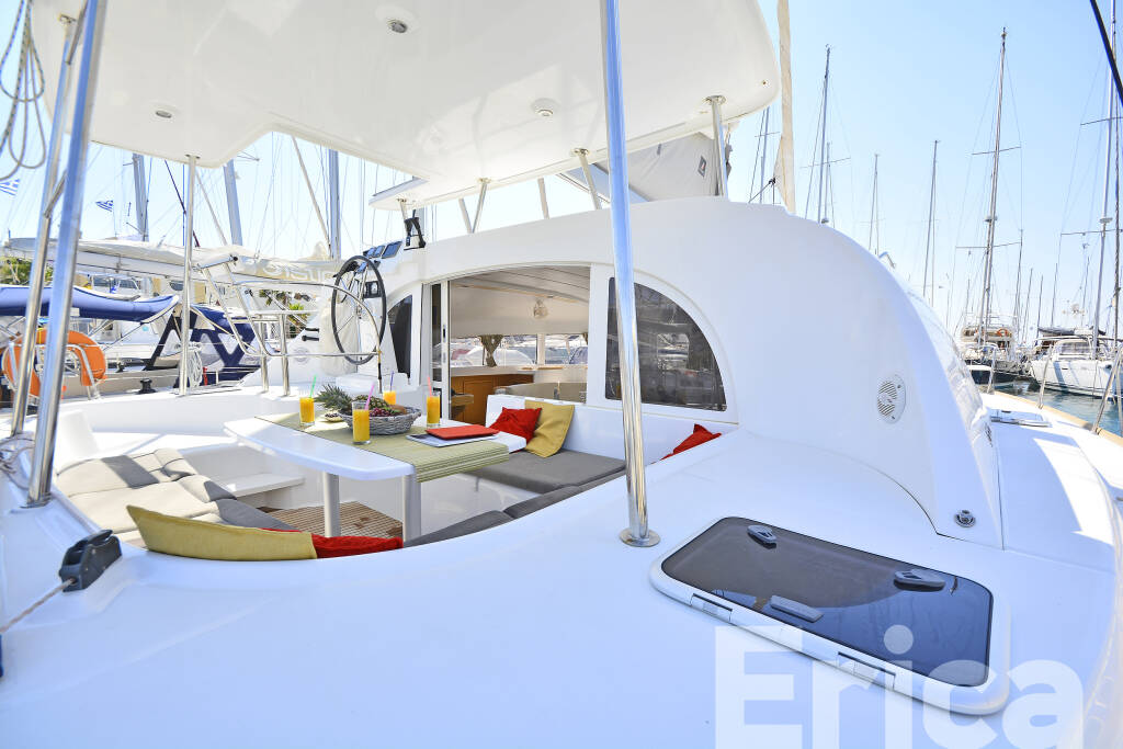 Catamaran Lagoon 380 S2 Erica, built in 2014 is anchored in the Kos, Kos Marina, Dodecanese, Greece. It has 4 + 2 cabins, can accommodate 8 + 2 people and has 2 toilets.