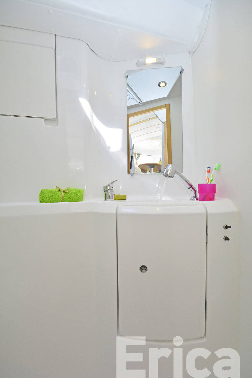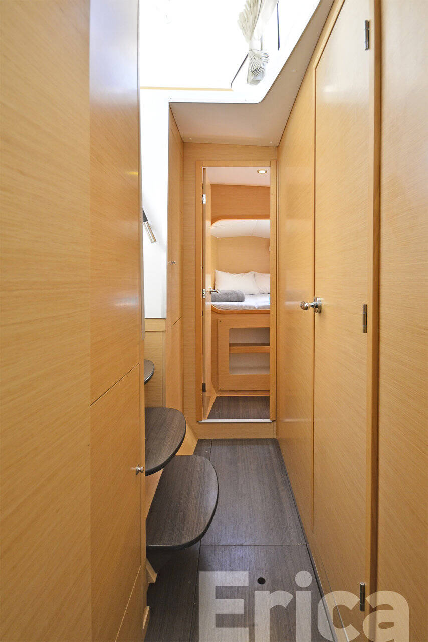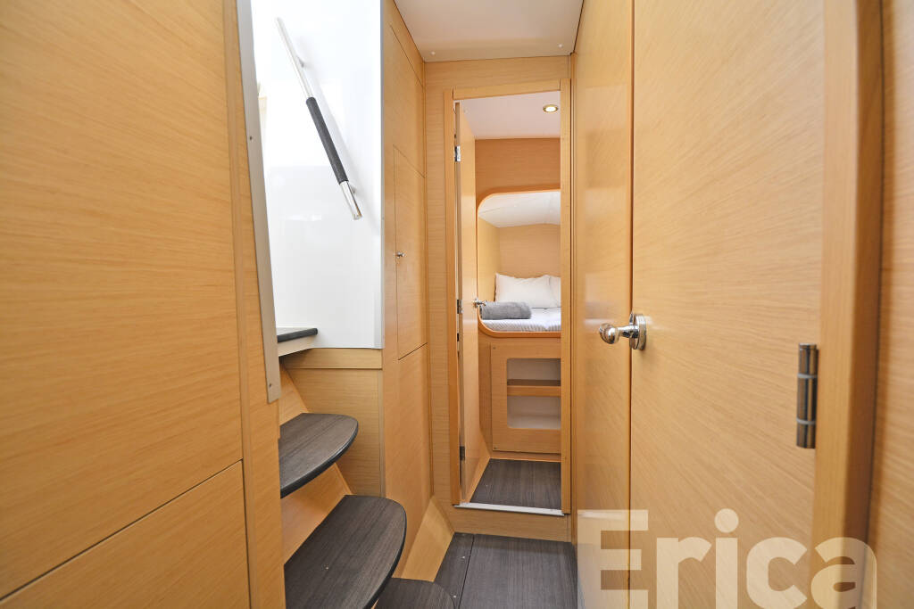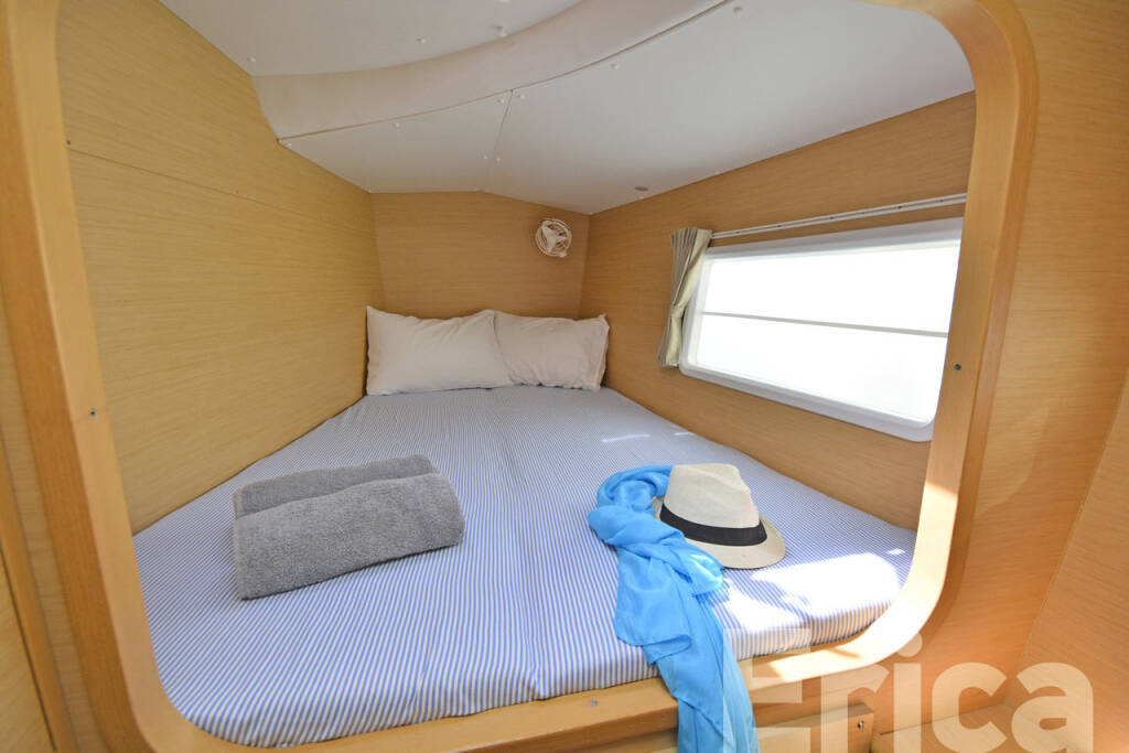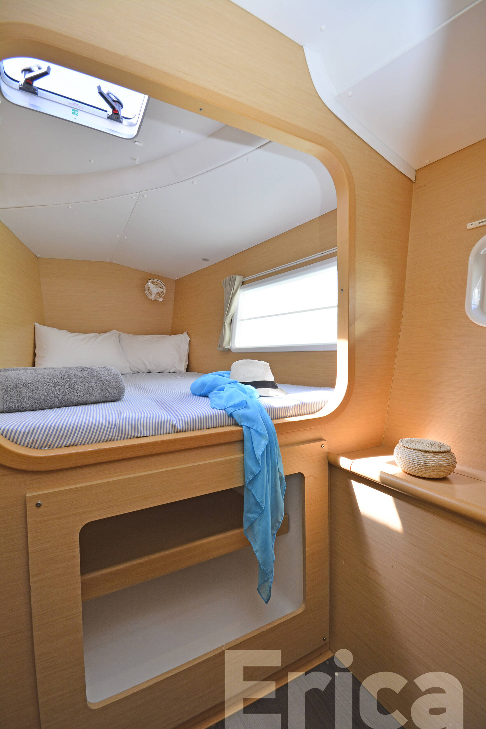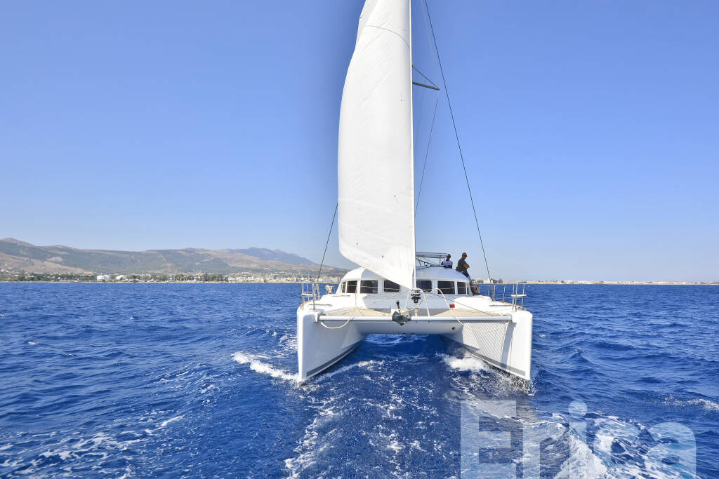 Catamaran Lagoon 380 S2 Erica, built in 2014 is anchored in the Kos, Kos Marina, Dodecanese, Greece. It has 4 + 2 cabins, can accommodate 8 + 2 people and has 2 toilets.