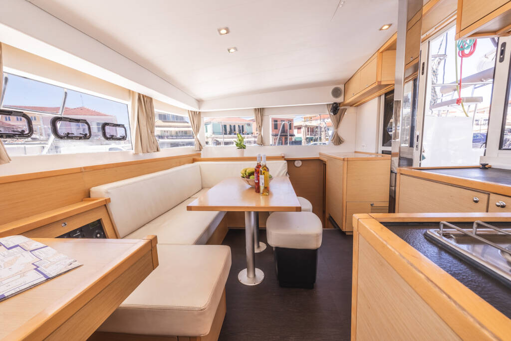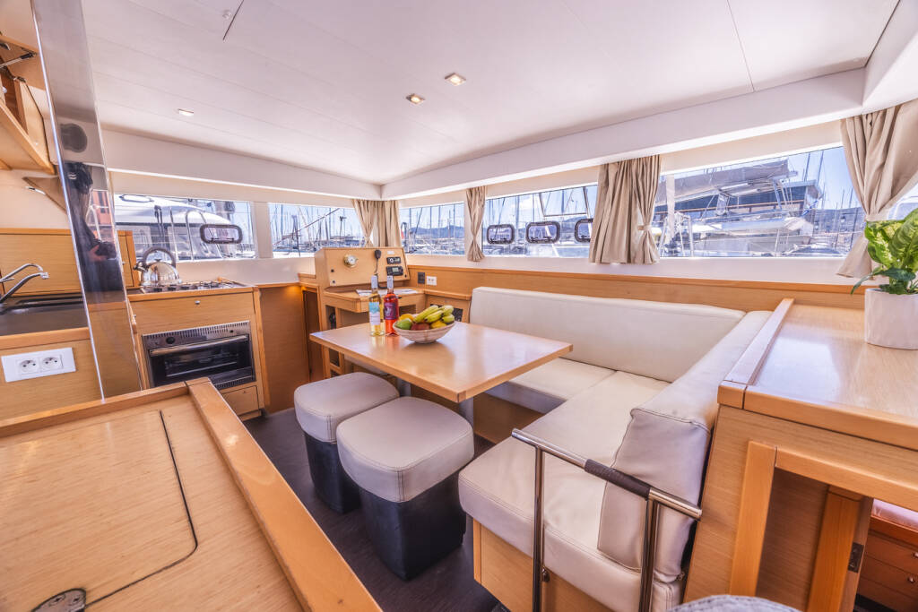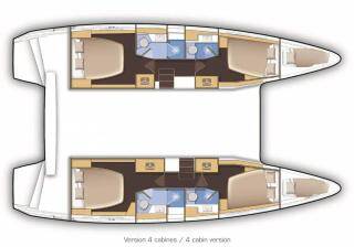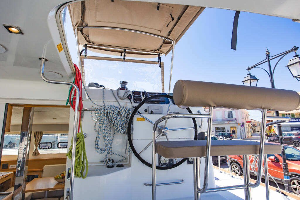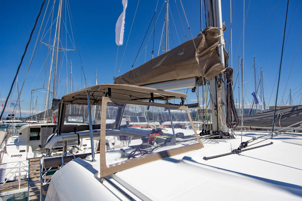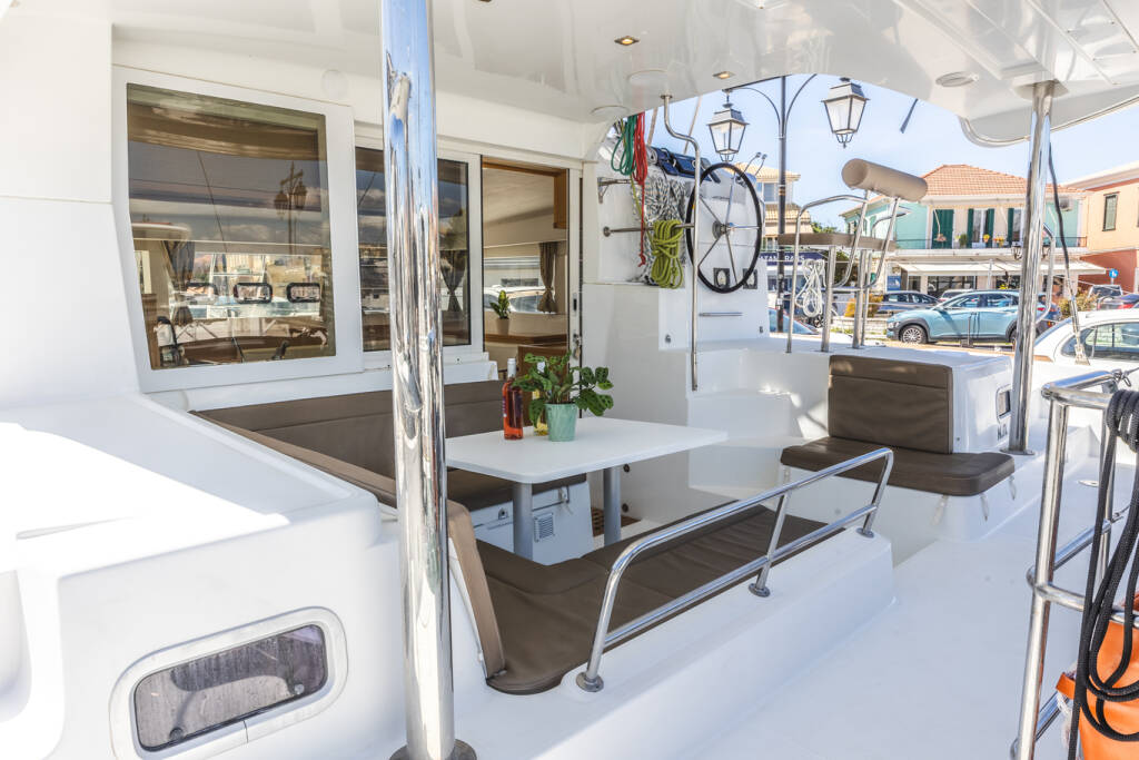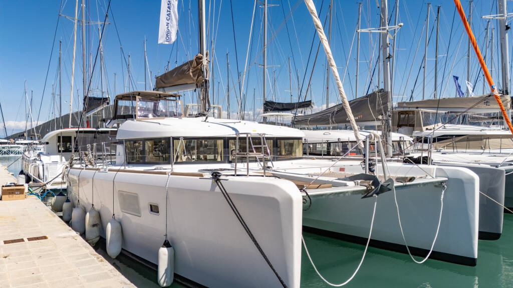 Catamaran Lagoon 39 Deep Blue, built in 2016 is anchored in the Lefkas main port, Ionian Islands, Greece. It has 4 + 2 cabins, can accommodate 8 + 2 people and has 4 toilets.