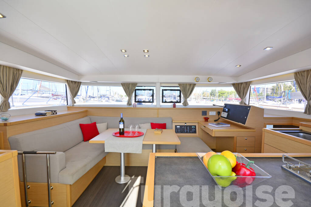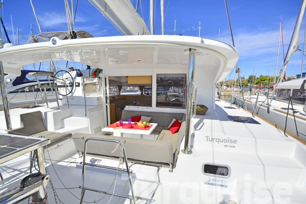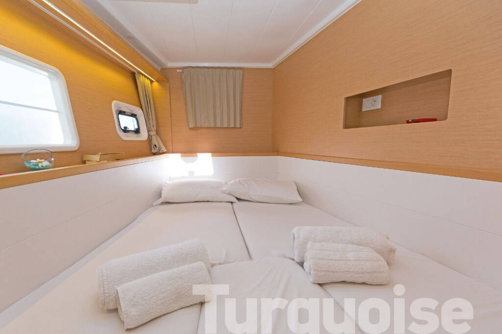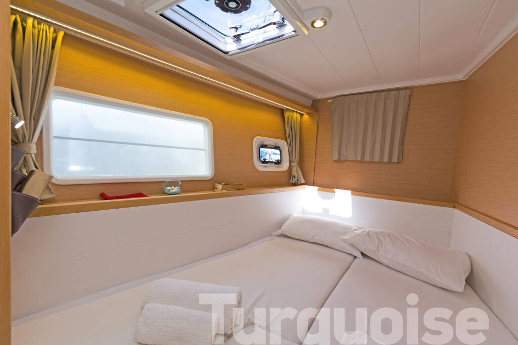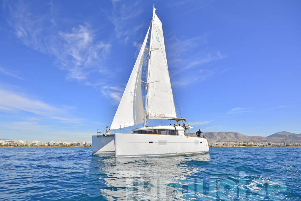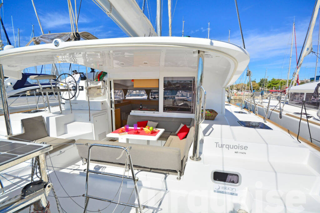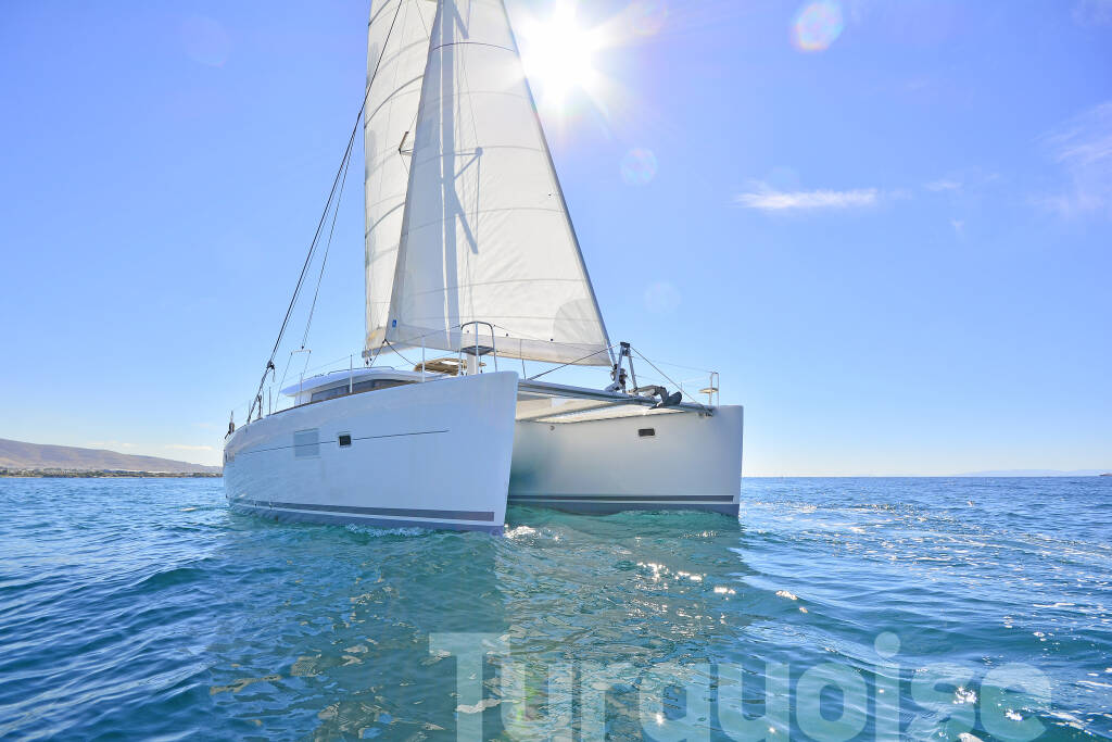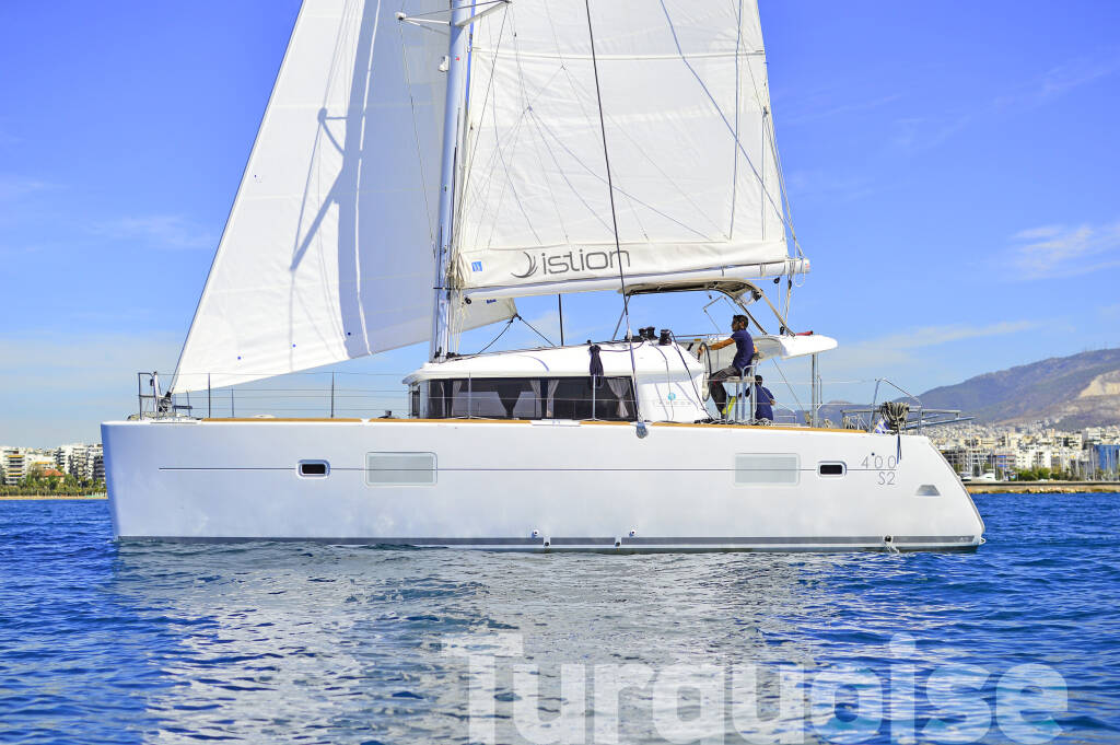 Catamaran Lagoon 400 S2 Turquoise, built in 2016 is anchored in the Lavrion, main port, Athens area/Saronic/Peloponese, Greece. It has 4 + 2 cabins, can accommodate 8 + 2 people and has 4 + 1 toilets.
