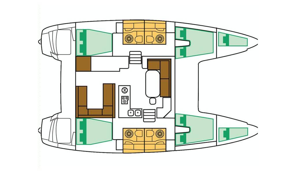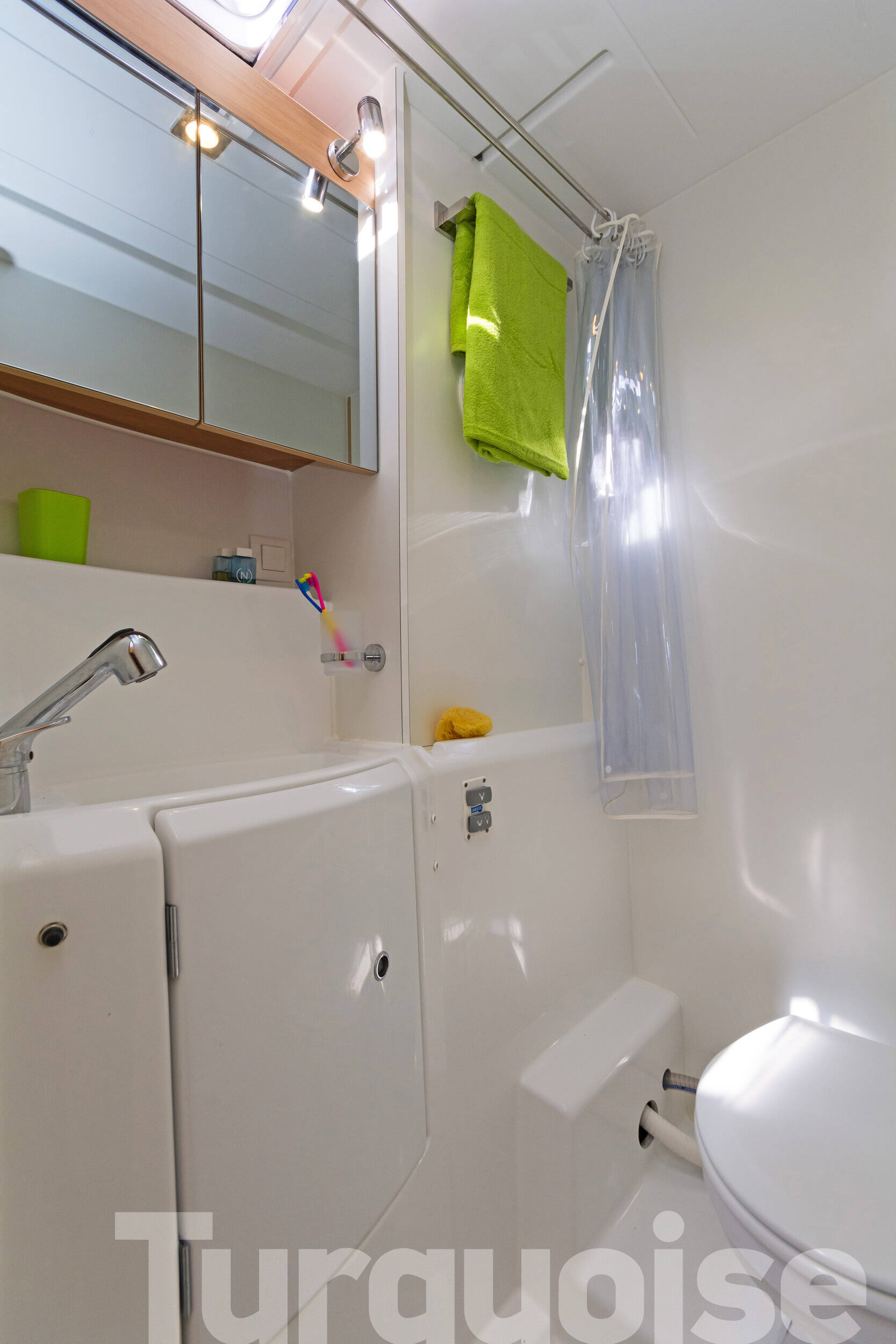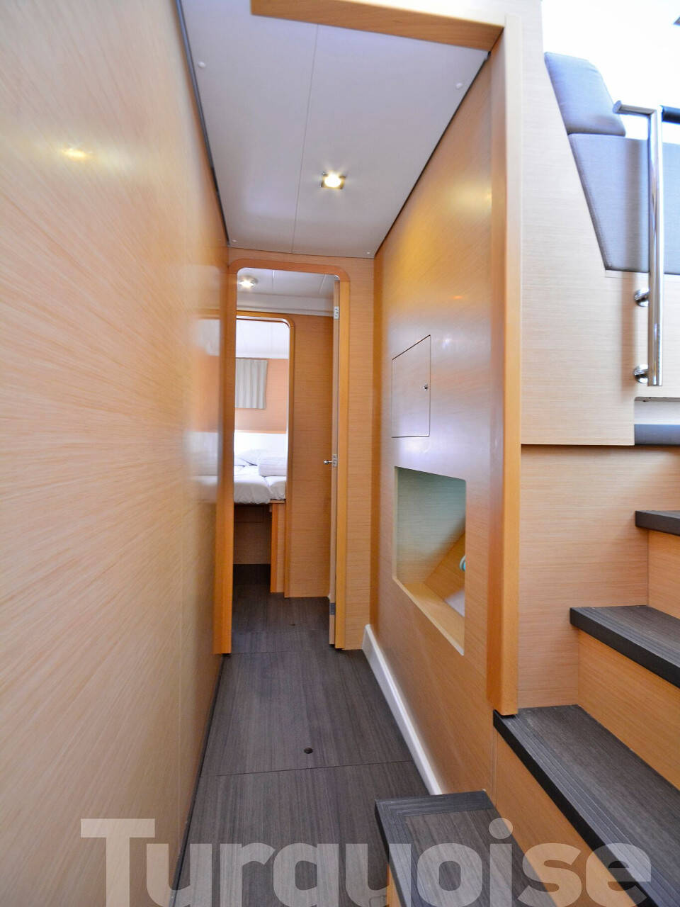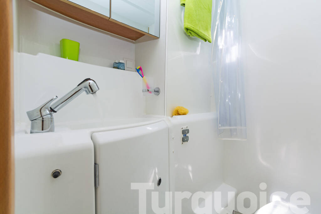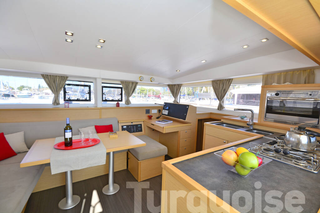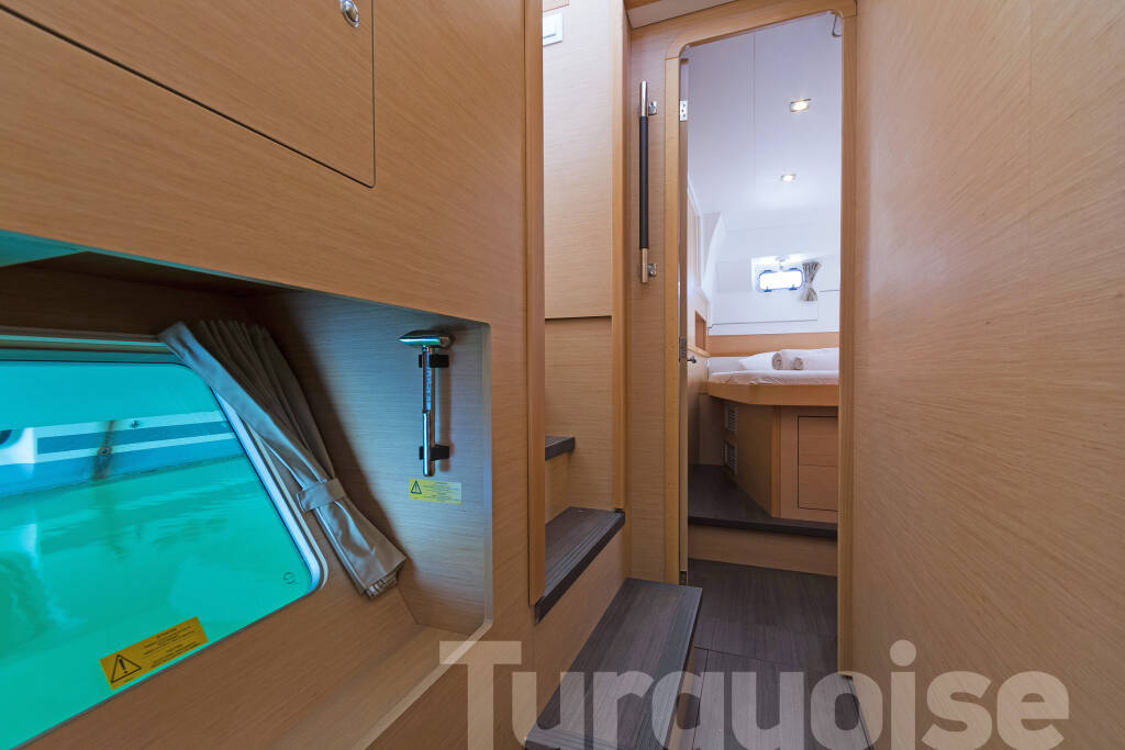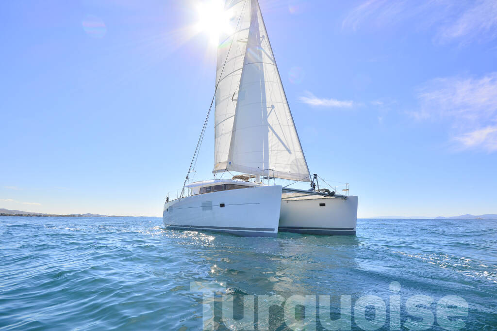 Catamaran Lagoon 400 S2 Turquoise, built in 2016 is anchored in the Lavrion, main port, Athens area/Saronic/Peloponese, Greece. It has 4 + 2 cabins, can accommodate 8 + 2 people and has 4 + 1 toilets.