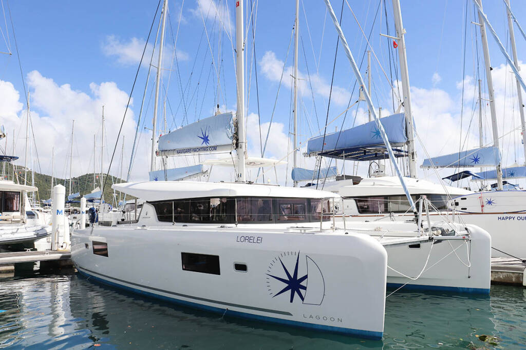 Catamaran Lagoon 42 Lorelei, built in 2023 is anchored in the BVI, Tortola, Nanny Cay Marina, British Virgin Islands, British Virgin Islands. It has 4 + 2 cabins, can accommodate 8 + 2 + 2 people and has 4 toilets.