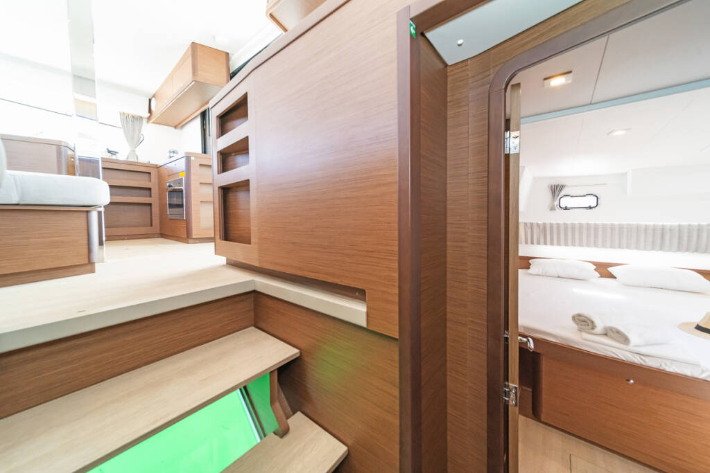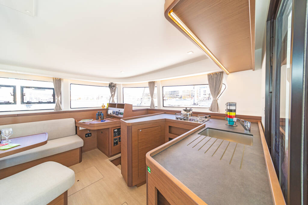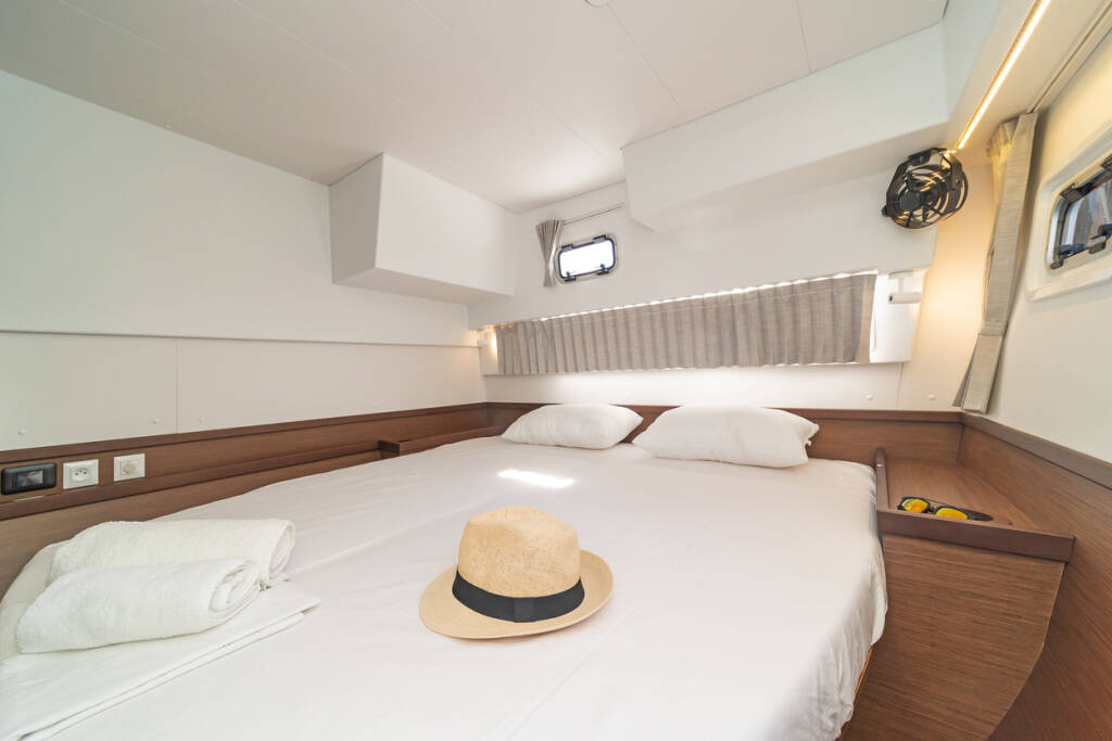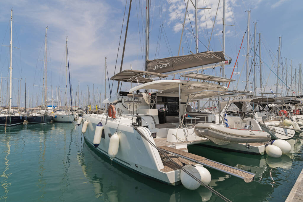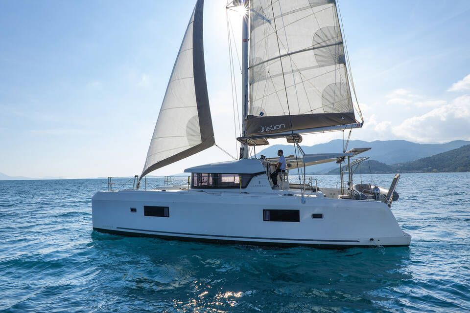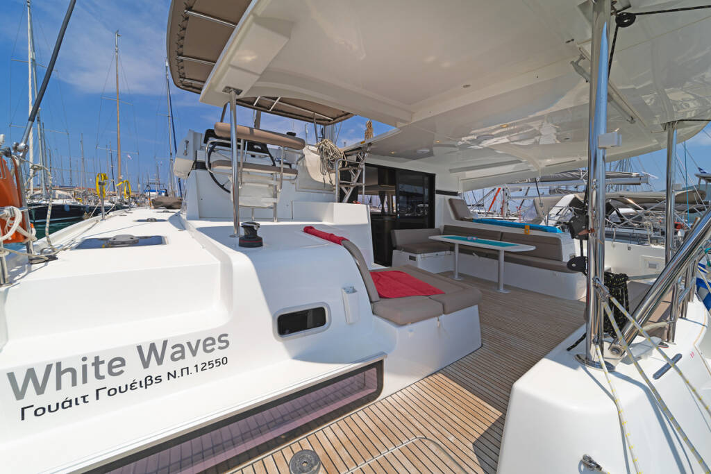 Catamaran Lagoon 42 White Waves, built in 2020 is anchored in the Lefkas, D-Marin, Ionian Islands, Greece. It has 4 + 2 cabins, can accommodate 8 + 2 people and has 4 + 1 toilets.