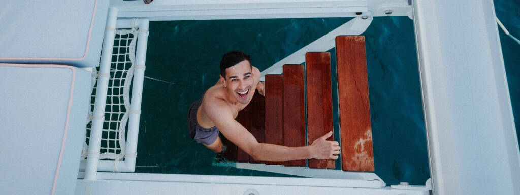 Extended sunpads across the trampoline and a new forward swim ladder for easier sea access.