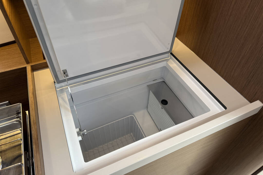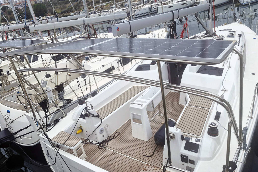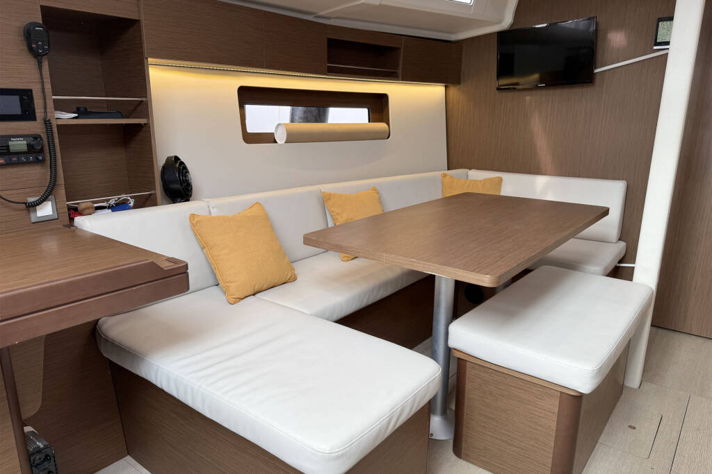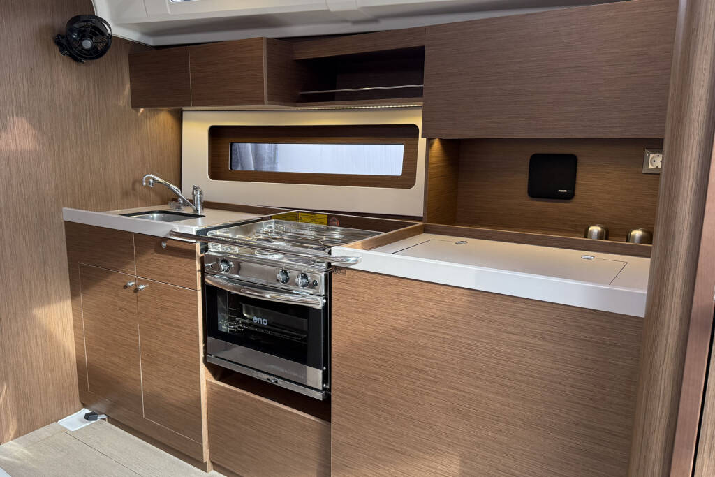 Railing hatch, black composite steering wheels, cockpit shower with hot/cold water, pantry: compact sink cover with cutting board, pantry: table stove/grill made of stainless steel with 2 flames, polyester bow platform with anchor roller and water stay, Fusion RA210 HiFi + speakers in the interior & waterproof external speakers , Openable window, insect screens on all opening hull windows, Saloon: Indirect LED lighting, Bottle cabinet under the floorboards, Electric windlass 1,000 W with remote control, Protective device on the transom, Stainless steel bow protector, Bracket for the outboard engine, Double berth in the saloon, Return of the traps into the cockpit, 1 starboard working winch, 2 genoa winches, genoa sheeting on the superstructure