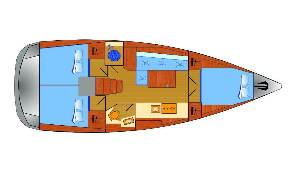 Bathing platform with teak slats, helm seat with teak slats, cockpit shower with hot / cold water, galley: compact sink cover with cutting board and seawater foot pump, galley: stainless steel table stove/grill with 2 burners + gimbals, Fusion HiFi + loudspeakers in interior & waterproof external loudspeakers, USB -Connection in saloon and cabins, Mosquito screen for hull window that can be opened, Saloon: Indirect LED lighting, Electric windlass 1,000 W + remote control, Transom protector, Stainless steel bow protection, Outboard motor bracket, Lazy-Bag and Lazy-Jack, electric halyard winch, genoa car adjustable from the cockpit, double berth in the saloon, center cleats, targa bar, separate shower, slatted frame in all cabins, window that can be opened