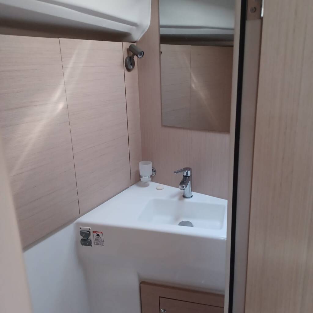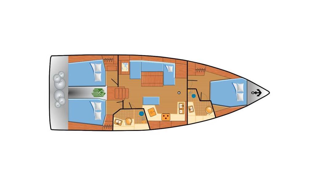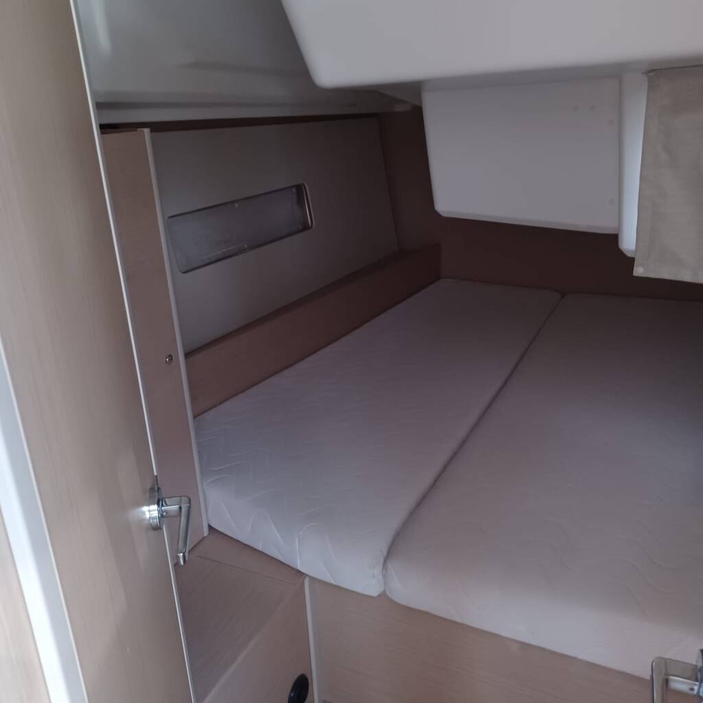 Helmsman seats with solid wood slats, Electric anchor windlass with remote control, Cockpit shower with hot / cold water, LED cockpit superstructure lighting, Indirect LED lighting in saloon, Front opening refrigerated compartment, Sink cover with cutting board, Fusion HiFi + speakers in the interior & waterproof external speakers, USB Double connection in the saloon and in the cabins, battery charge indicators (Navicolor screen), insect screen on the hull window that can be opened, protection on the transom, protection bow, bracket for the outboard motor, double berth in the saloon, foot pump seawater/fresh water, additional fresh water tank (total 565 l) fan in the Salon and in the cabins, electric halyard winch, companionway blinds, return of the halyards to the cockpit, 2 genoa winches, polyester bow platform with anchor roller and water stay (to attach the gennaker), genoa sheet traveler rails on the side decks with line adjustment, windlass control with counter from Cockpit operable, railing access