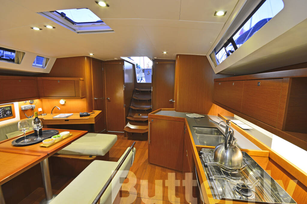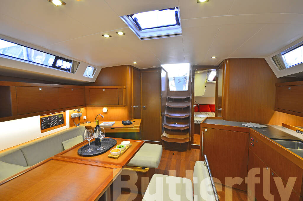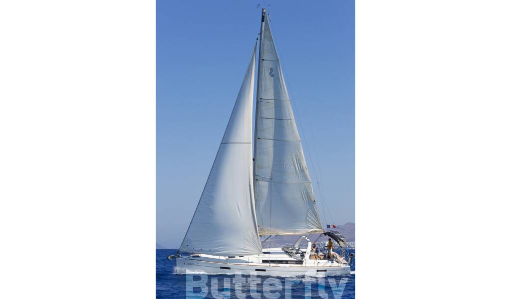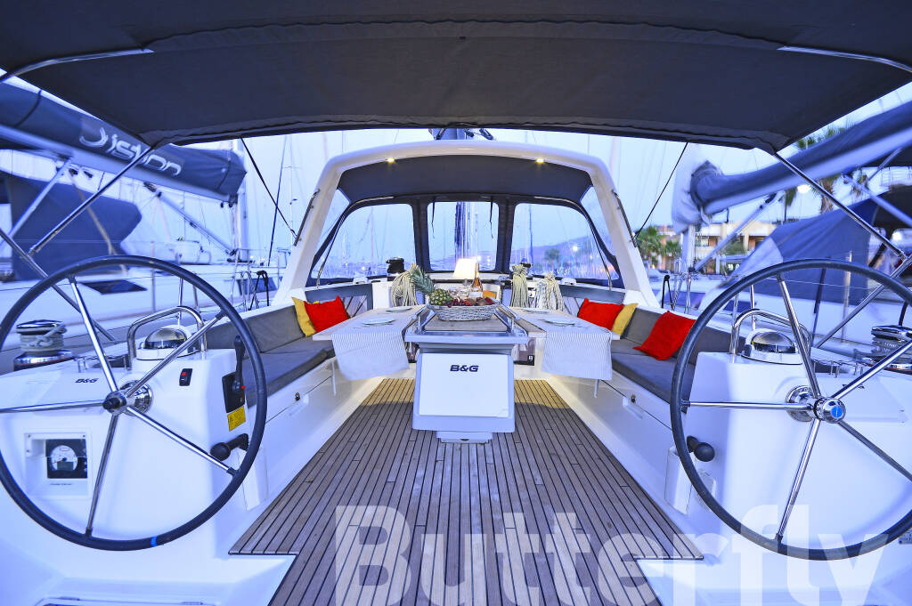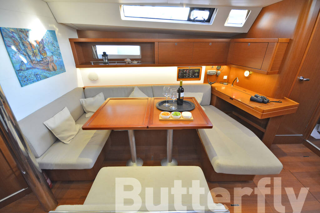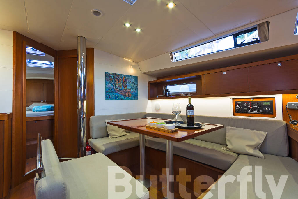Sailing yacht Oceanis 45 Butterfly, built in 2014 is anchored in the Kos, Kos Marina, Dodecanese, Greece. It has 4 cabins, can accommodate 8 + 2 people and has 2 toilets.