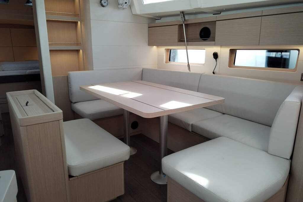 Bow protection made of stainless steel, protective device on the transom, cockpit bench extensions, cockpit table with central storage compartment and handrail made of stainless steel and lighting, bracket for the outboard engine, Hifi: Fusion + speakers in the interior & waterproof external speakers, double berth in the saloon, foot pump seawater / fresh water sink cover made of compact clay with Cutting board Fans in all cabins, fly screens, indirect LED lighting, battery charge level indicators, Navicolor screen (3.5 ""), 2 genoa winches, German mainsheet system (main sheet with folding runner at the helm), polyester bow platform with anchor roller and water stay, Genoa sheet traveler rails on the side decks with line adjustment, lazy bag and lazy jack, center cleats, railing access, teak on sun loungers, sun cushions for the companionway, plancha gas grill in the cockpit, laminate flooring, openable window