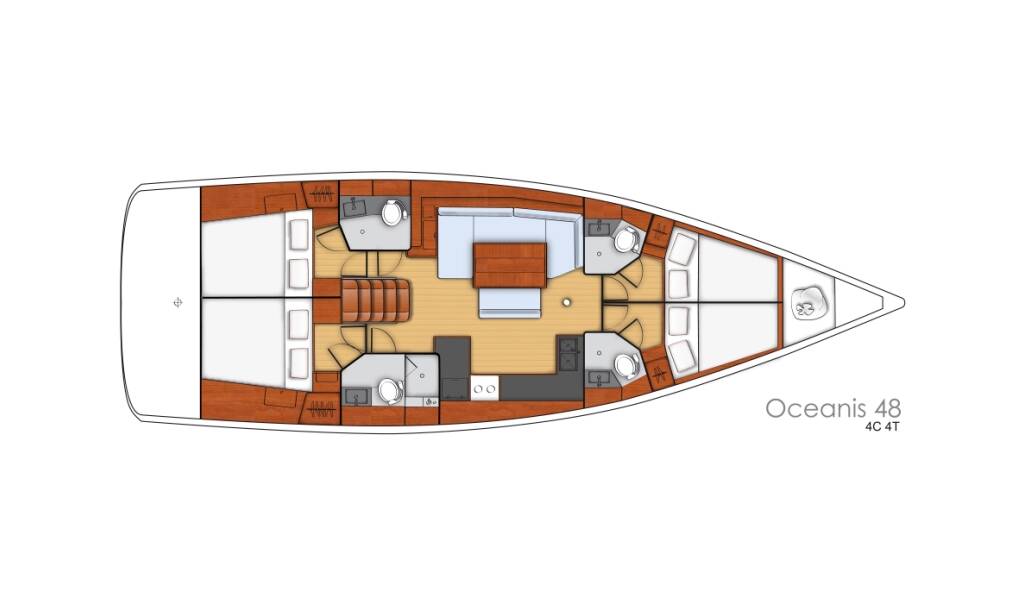 Sailing yacht Oceanis 48 Flou, built in 2018 is anchored in the ACI Marina Split, Split region, Croatia. It has 4 cabins, can accommodate 8 + 2 people and has 4 toilets.