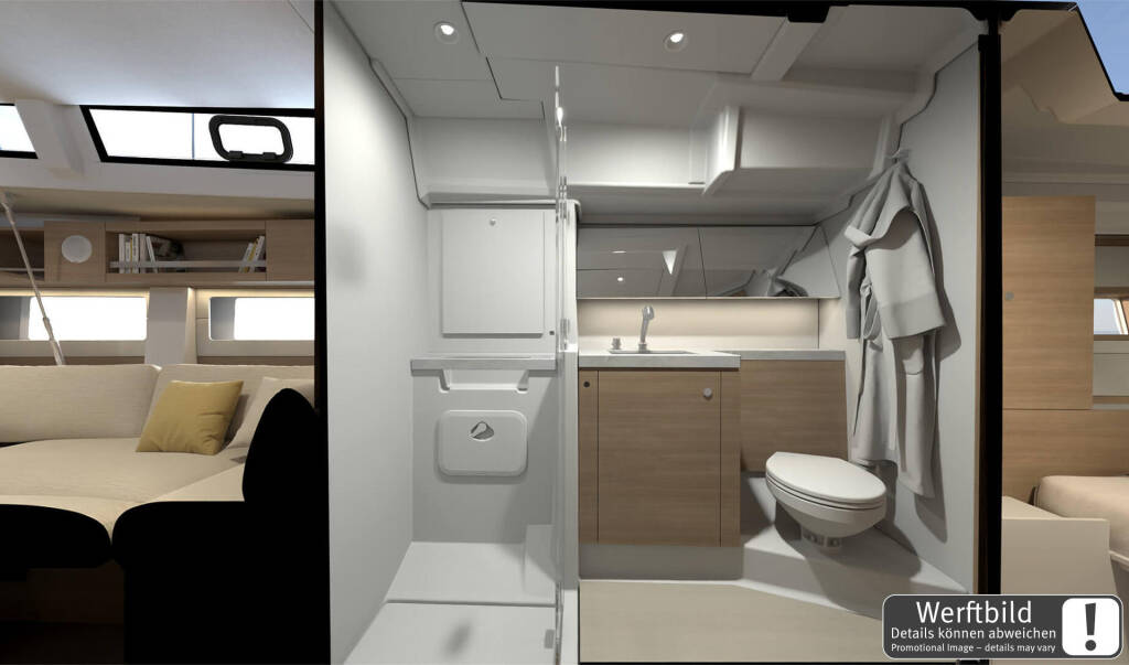 Three-blade folding propeller, electric engine controls on the console, electric bathing platform with remote control, hot/cold cockpit shower, Fusion RA210 with indoor/outdoor speakers, direct and indirect LED lighting, USB ports in the saloon and cabins, stainless steel bow guard, transom guard, double berth in the saloon, additional 300 L water tank (total 720 L), LOFRANS 1,500 W electric anchor winch, teak in the cockpit, on the cockpit benches, on the helm seats and on the bathing platform, center cleats, 176 L 12V refrigerator with bow opening, H60.2 STA genoa winches, bowsprit, 2000 W inverter