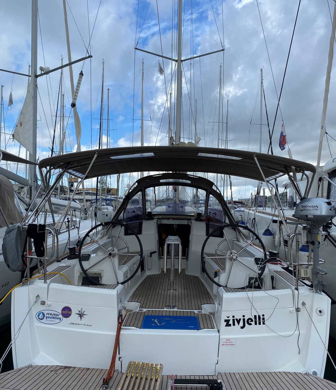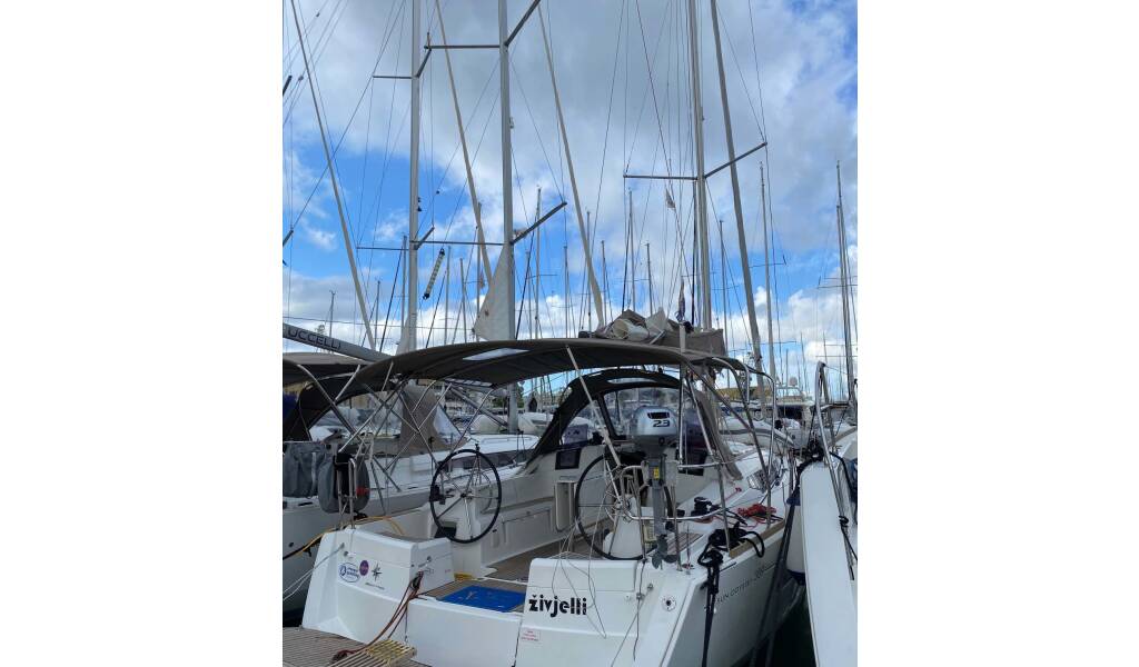 Sailing yacht Sun Odyssey 389 živjelli, built in 2017 is anchored in the Corfu, Gouvia Marina, Ionian Islands, Greece. It has 3 cabins, can accommodate 6 + 2 people and has 1 toilets.