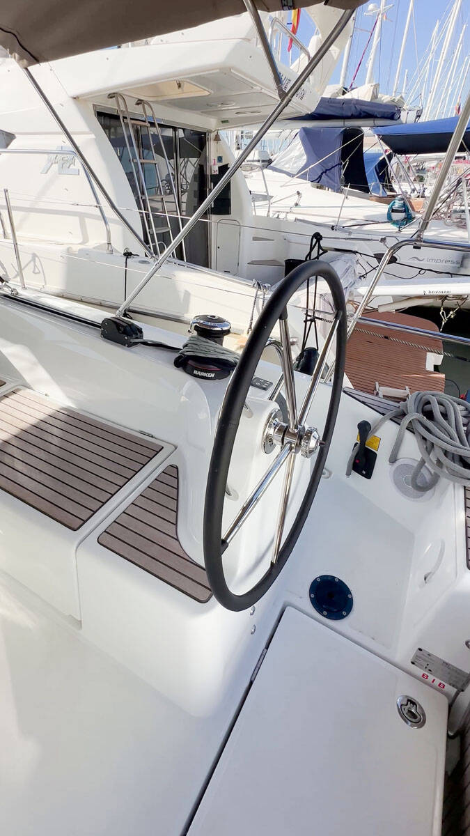 Sailing yacht Sun Odyssey 410 Sea Pearl, built in 2024 is anchored in the Palma de Mallorca, La Lonja, Balearic Islands, Spain. It has 3 cabins, can accommodate 6 + 2 people and has 2 toilets.