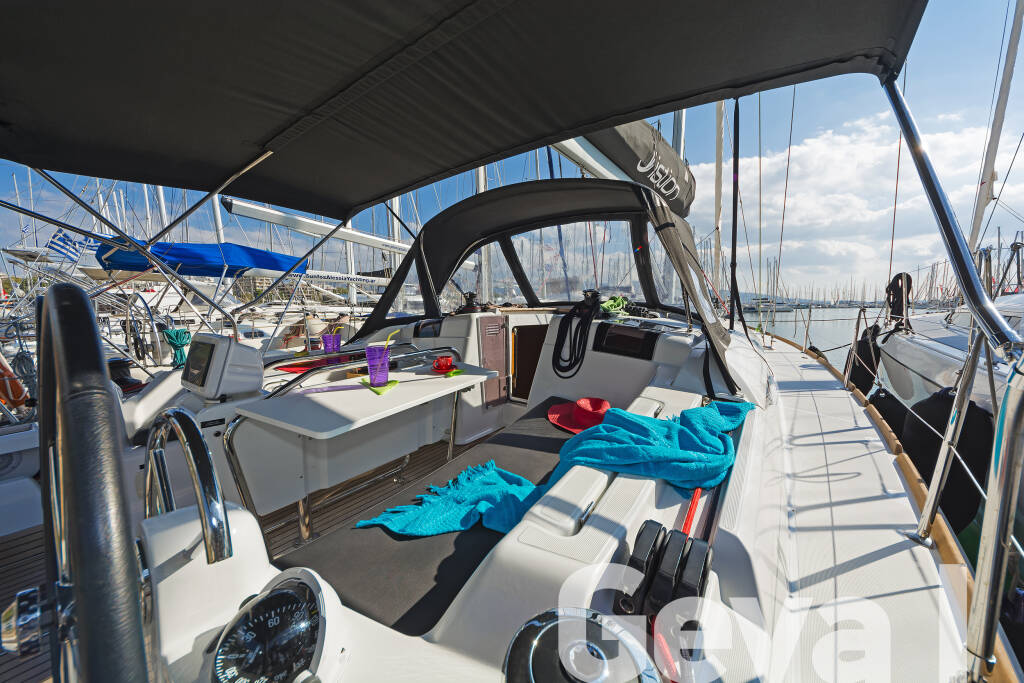 Sailing yacht Sun Odyssey 419 Geva I, built in 2018 is anchored in the Rhodes New Marina, Dodecanese, Greece. It has 3 cabins, can accommodate 6 + 2 people and has 2 toilets.