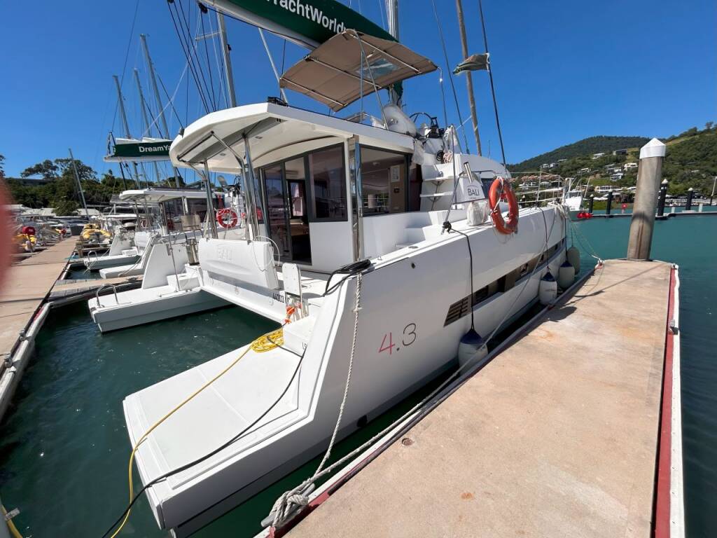 Catamarano Bali 4.3 SINATRA, costruito nel 2017 è ormeggiato in Whitsundays, Airlie Beach, Coral Sea Marina, Whitsunday Region of Queensland, Australia e Oceania. Ha 4 cabine, può ospitare 8 persone e dispone di 4 bagni.