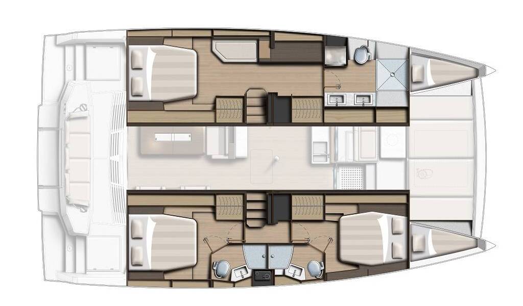 Catamarano Bali 4.4 Relentless, costruito nel 2023 è ormeggiato in San Diego, Harbor Island, California, USA. Ha 3 + 1 cabine, può ospitare 6 persone e dispone di 3 bagni.