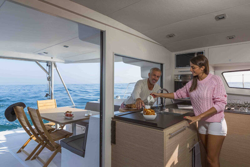 Catamarano Bali 4.5 TANGARA, costruito nel 2020 è ormeggiato in Guadeloupe, La Marina Bas du Fort, Guadalupa, Caraibi. Ha 4 + 2 cabine, può ospitare 8 + 2 + 2 persone e dispone di 4 bagni.