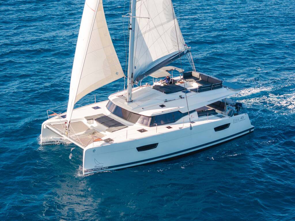 Catamarano Fountaine Pajot Elba 45 Detour, costruito nel 2022 è ormeggiato in BVI, Tortola, Nanny Cay Marina, Isole Vergini Britanniche, Isole Vergini Britanniche. Ha 4 + 1 cabine, può ospitare 8 + 1 persone e dispone di 5 bagni.
