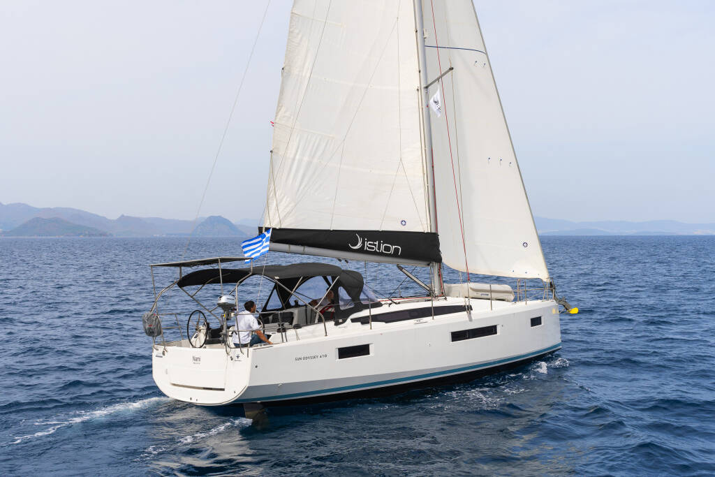 Barca a vela Sun Odyssey 410 Nami, costruito nel 2021 è ormeggiato in Kos, Kos Marina, Dodecaneso, Grecia. Ha 3 cabine, può ospitare 6 + 2 persone e dispone di 2 bagni.