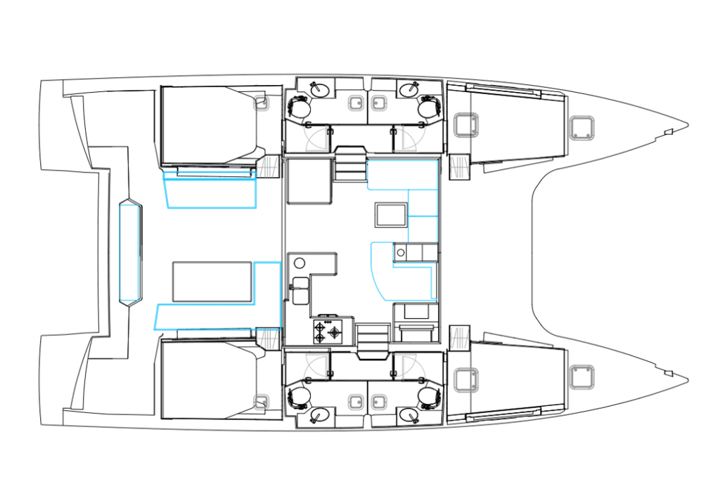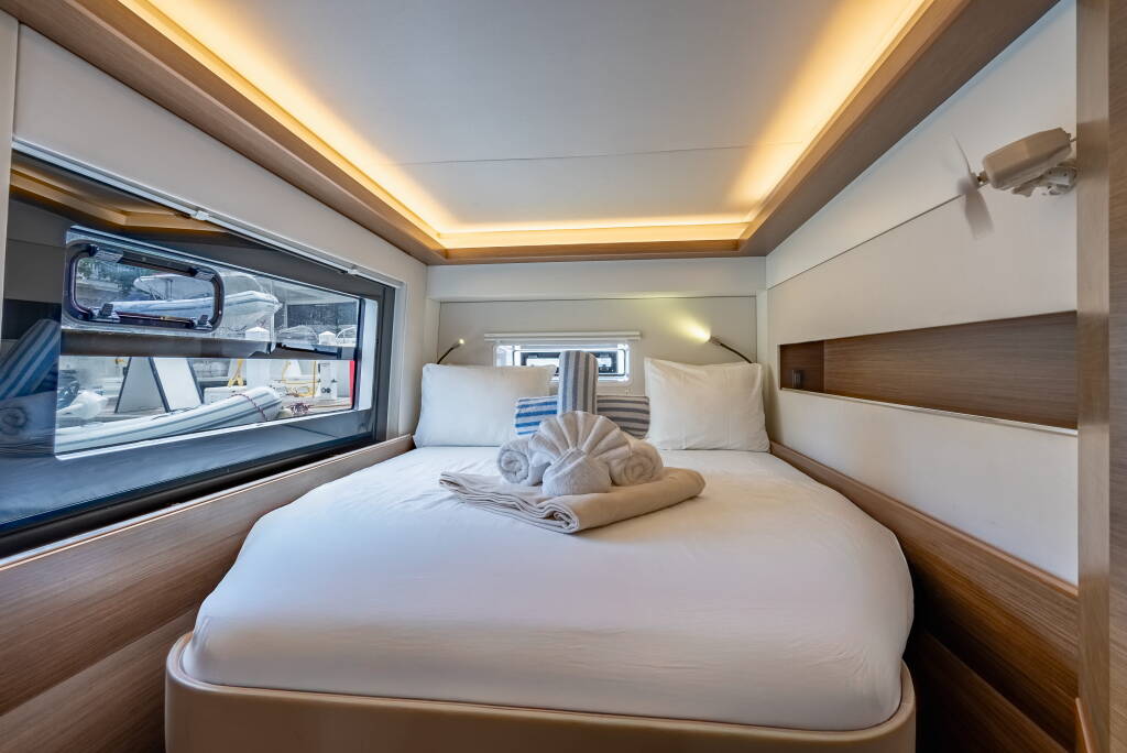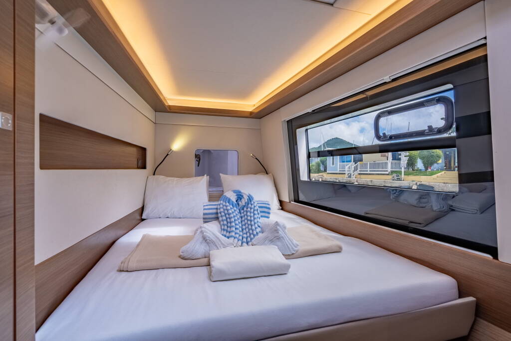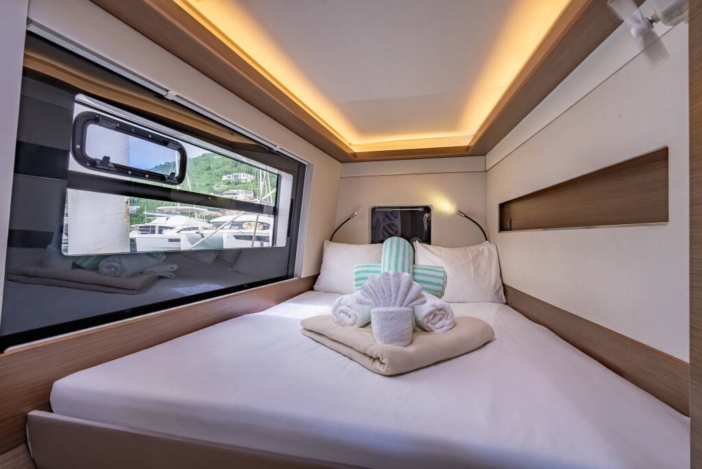 Katamarán Nautitech 46 Luna, vyrobená v roku 2020, je ukotvená v BVI, Tortola, Nanny Cay Marina, Britské Panenské Ostrovy (BVI), Britské Panenské ostrovy . Má 4 + 2 kajút, poskytuje ubytovanie pre 8 + 2 ľudí a má 4 toalety.